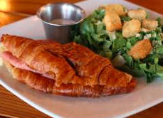 Croissant relleno con jamón de pavo, queso manchego, arándano y chipotle, con ensalada verde.