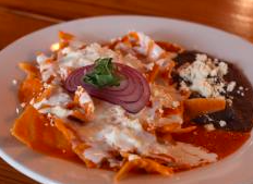 Frituras de maíz, bañados en salsa roja o verde, queso fresco, crema, cebolla y cilantro.