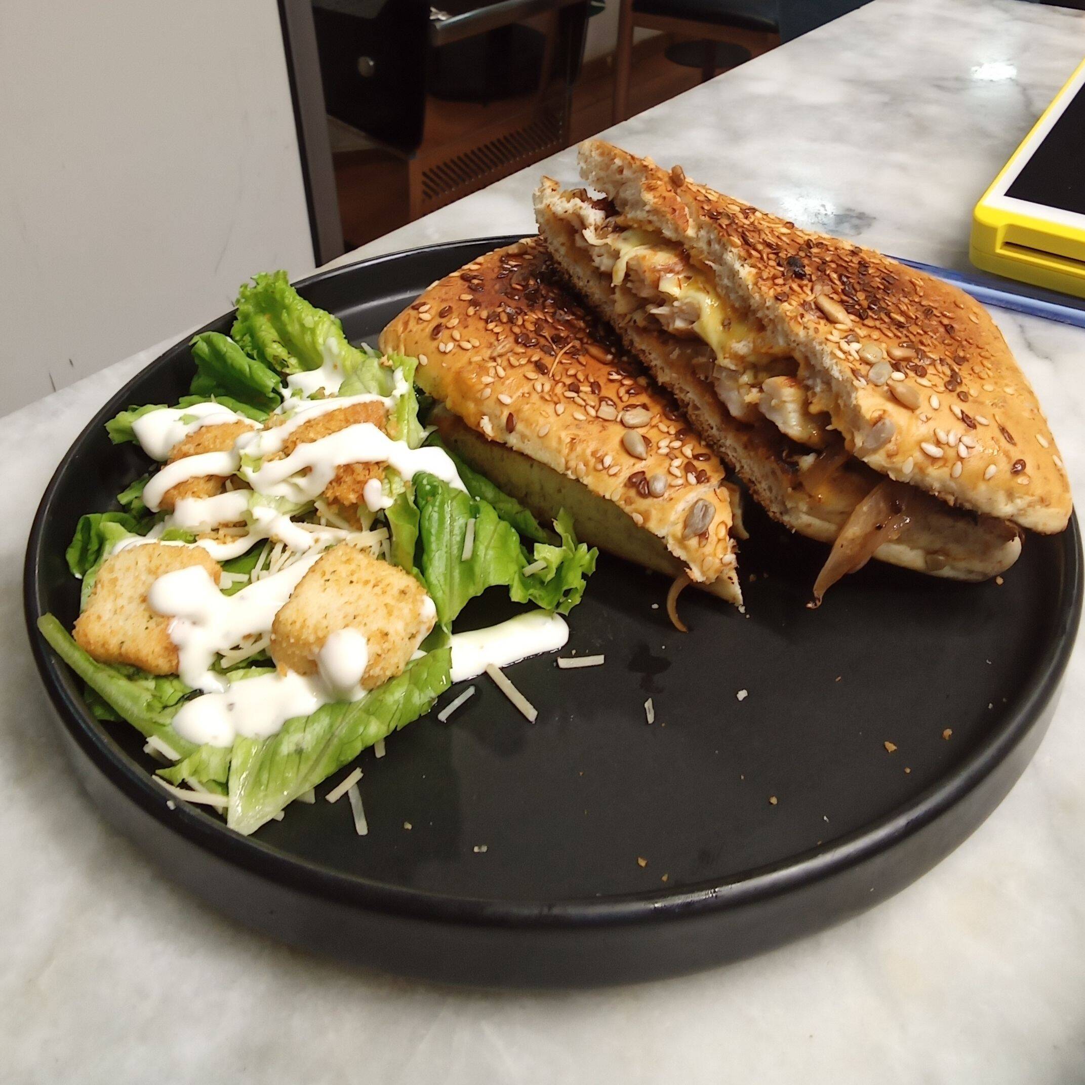 Pollo a la plancha, aderezo de chipotle, queso manchego y cebolla caramelizada en pan multigrano, acompañado de ensalada verde