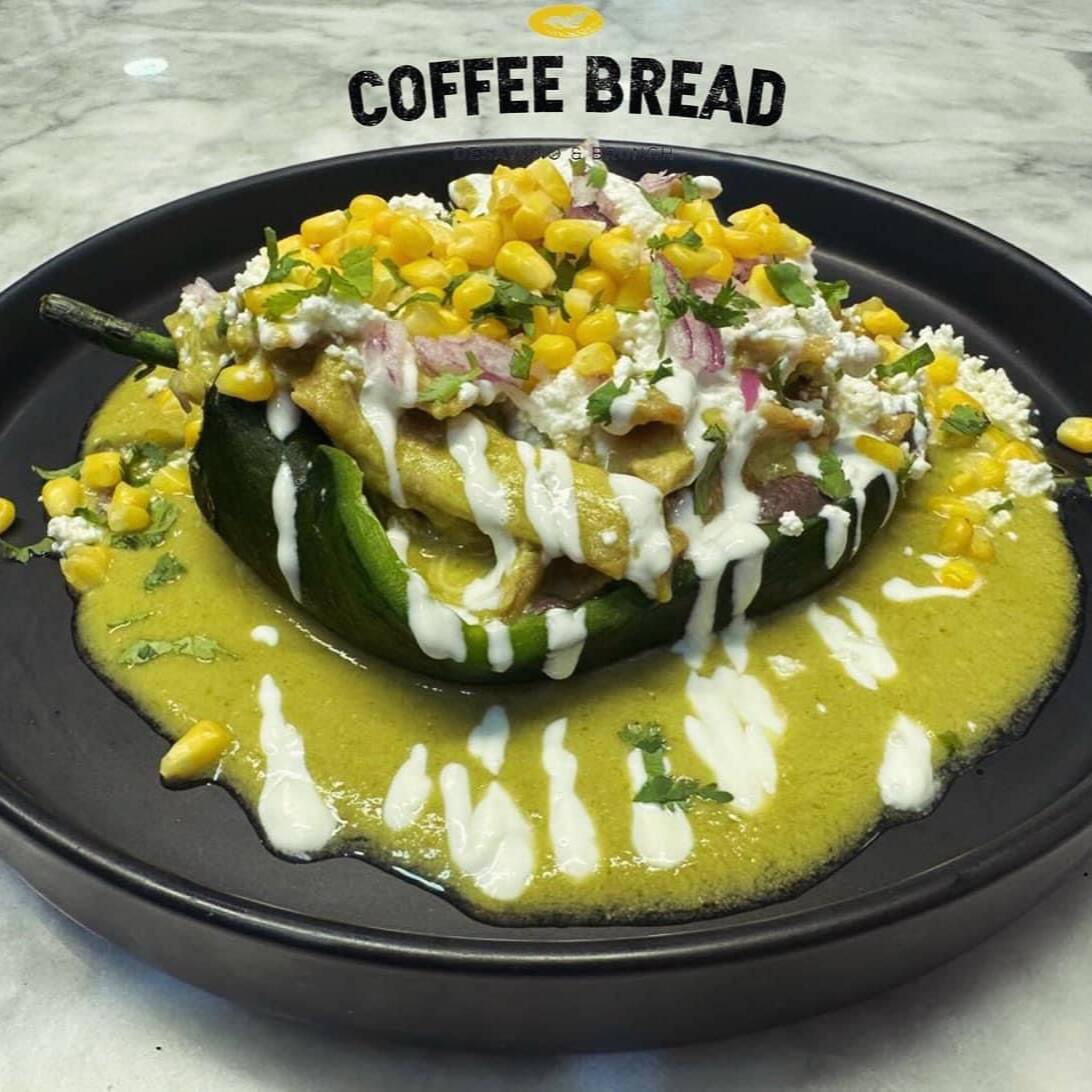 Chile Poblano Tatemado Relleno de Chilaquiles en Salsa Cremosa, Queso Manchego, Crema, Cebolla, Elote, Cilantro, Frijol Negro Refrito