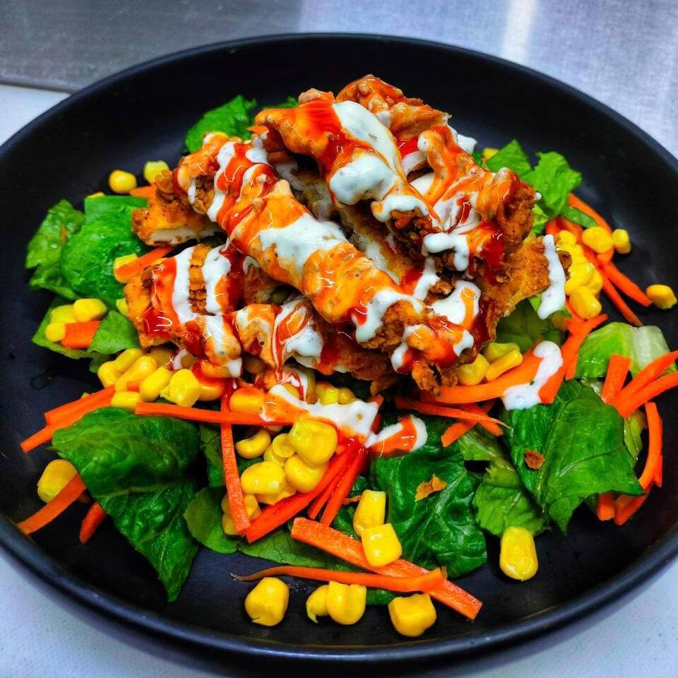 Mix de lechugas, elote y zanahoria con fajitas de pollo empanizado cubierto de salsa búfalo y aderezo ranch.