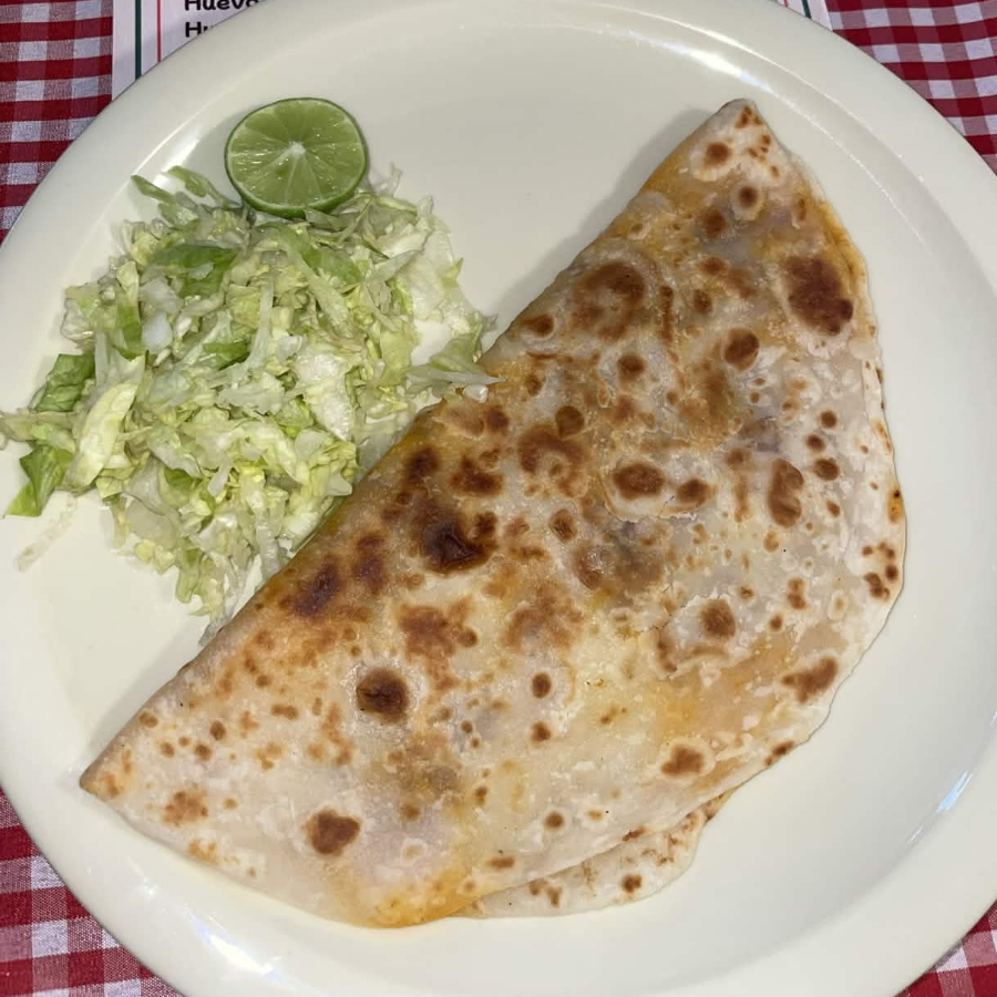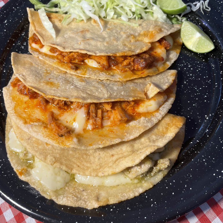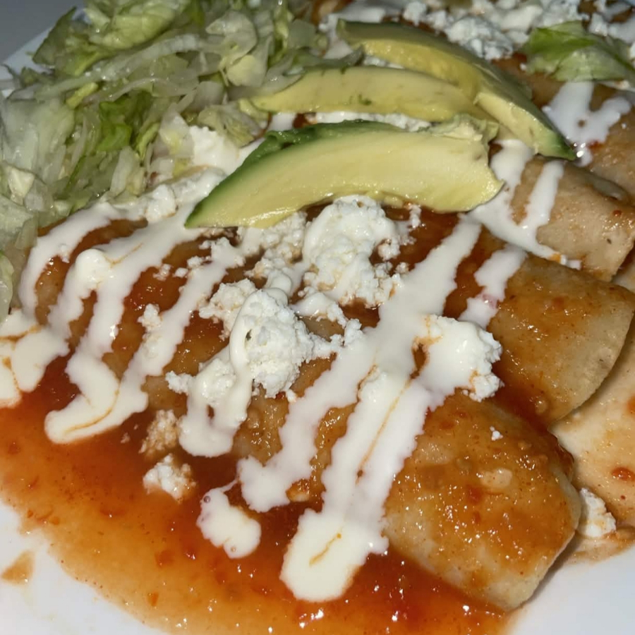 5 tortillas recien hechas bañadas en salsa de tomate, rellenas de queso fresco. Incluye lechuga, crema, aguacate y frijoles.