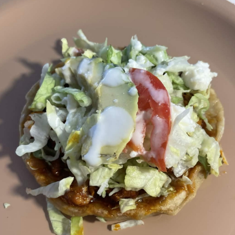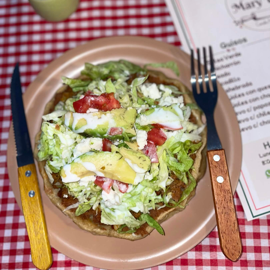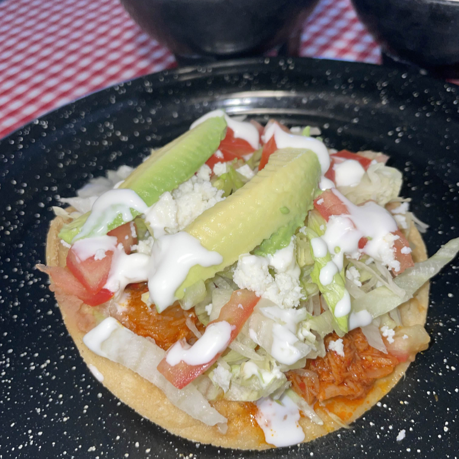 Tostada de maiz, con frijoles y guiso. Lechuga, crema, queso fresco, aguacate y tomate.