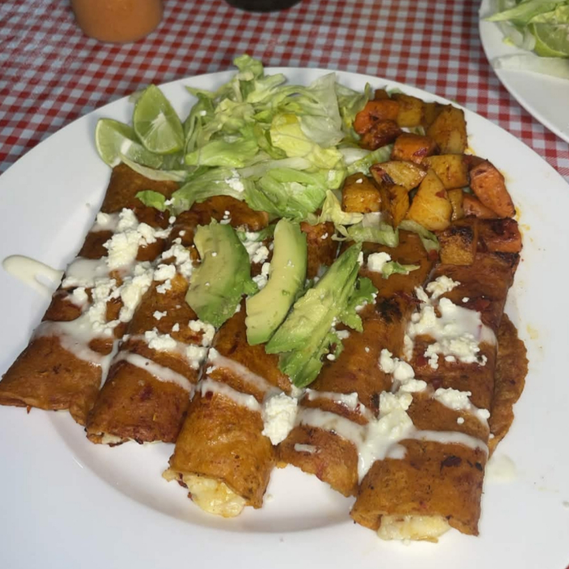 5 tortillas recien hechas, con queso. Lechuga, aguacate, crema frijoles. Trozos de papa y zanahoria enchiladas.