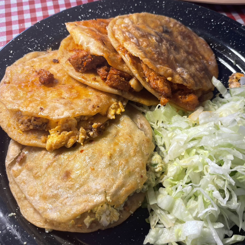 De maiz, con frijoles 1 o 2 guisos a elegir. Lechuga, queso, crema, aguacate y tomate.