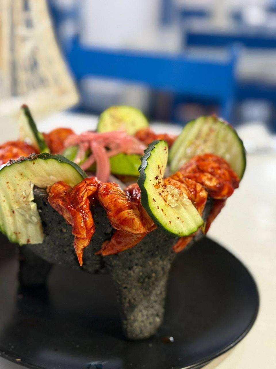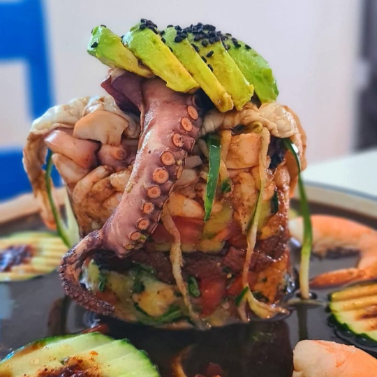 Ceviche, medallón de atún, camarón coctelero, camarón curtido, camarón para pelar, tentáculo de pulpo, bañado en salsa negra y coronado con aguacate.