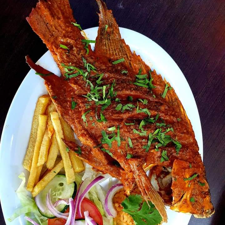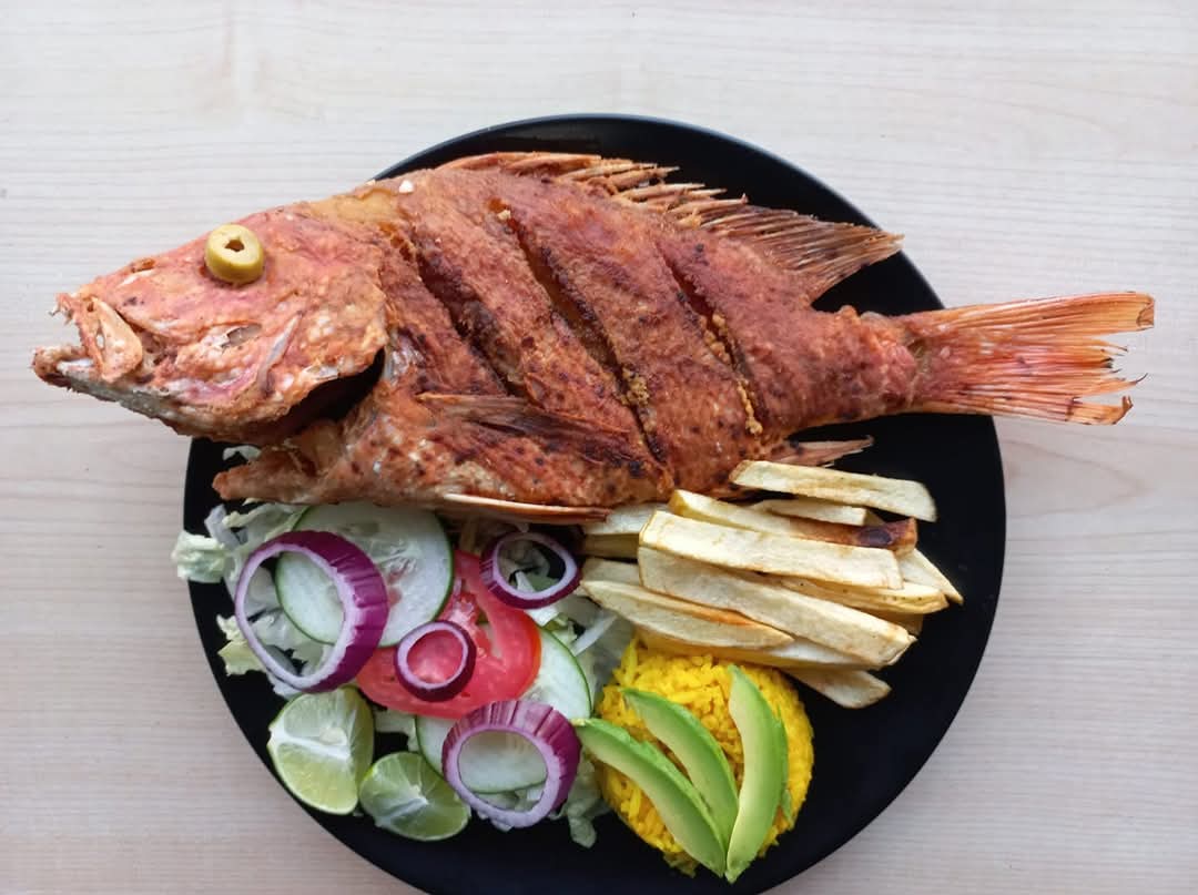 Pescado frito a la diabla, porción de papas fritas, arrozn ensalada, totopos, dip y salsa