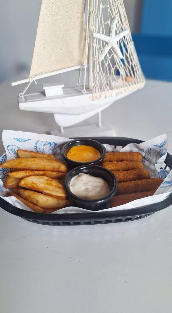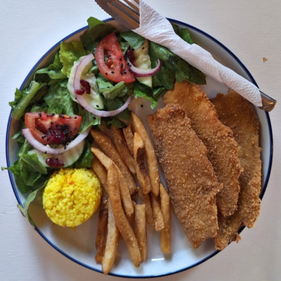 Puntas de pescado con arroz y papas fritas.