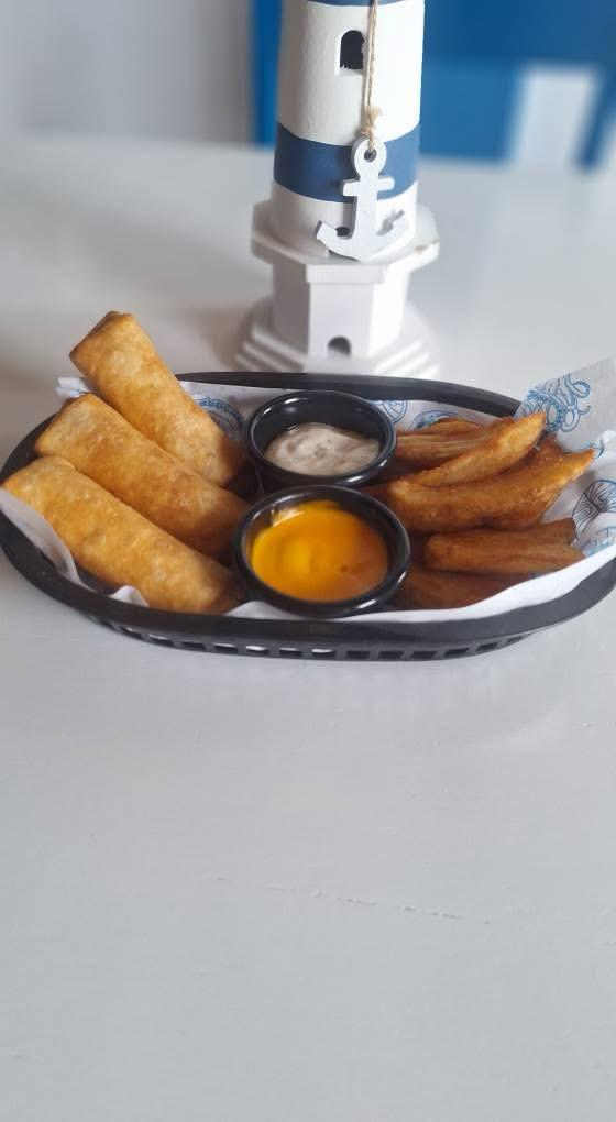 4 camarones grandes, rellenos de queso, envueltos con tocino y empanizados con guarnición de arroz, ensalada y un exquisito dip de la casa.