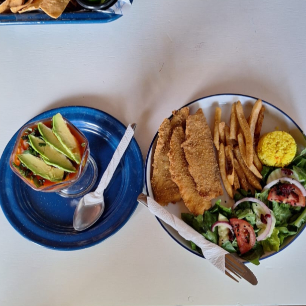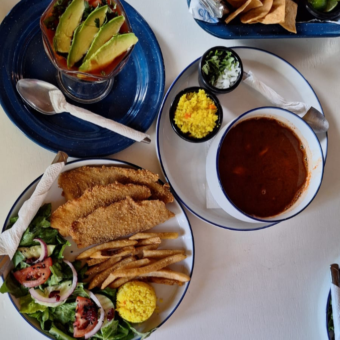 Filete de tilapia, sopa de mariscos y cóctel chico.