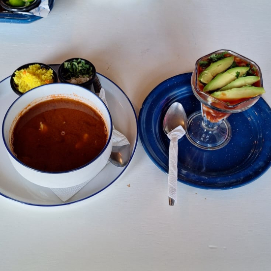 Sopa de mariscos y cóctel chico.