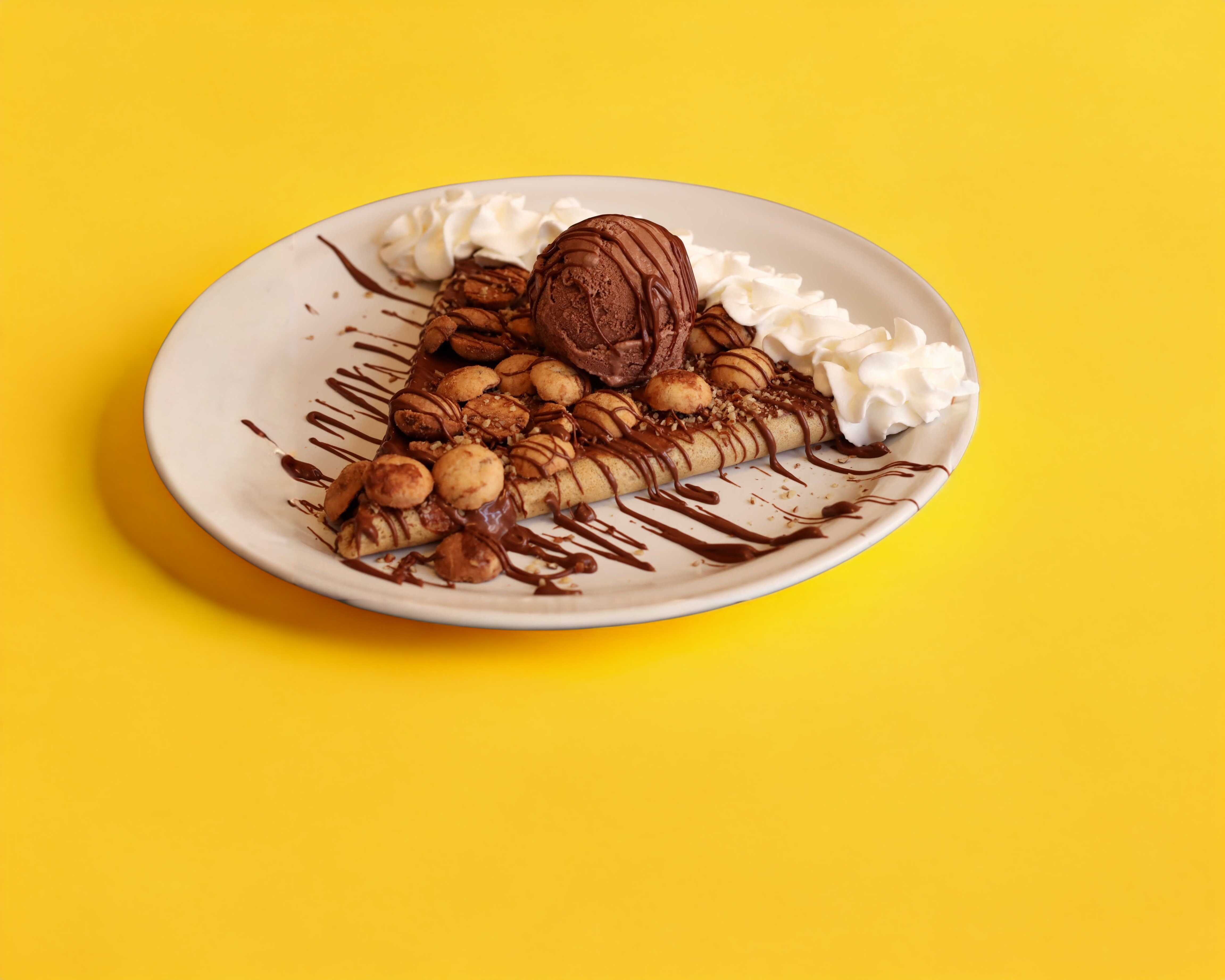 Riquísima Crepa de Cajeta con Nuéz, acompañada de un heladito licuado de Chocomilk y, ¡con un descuento increíble!