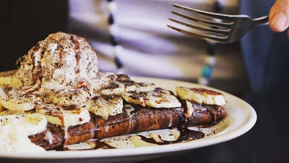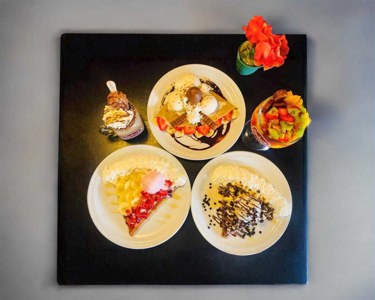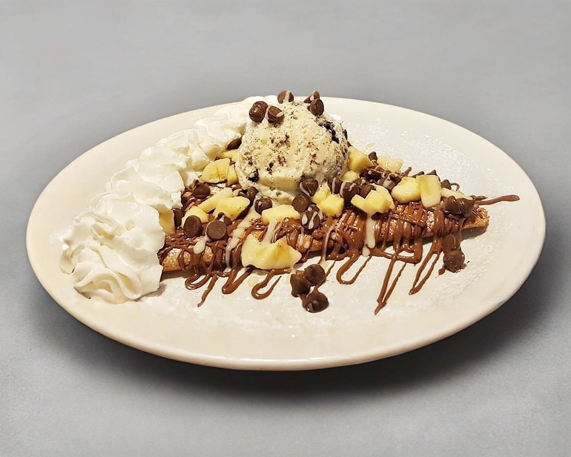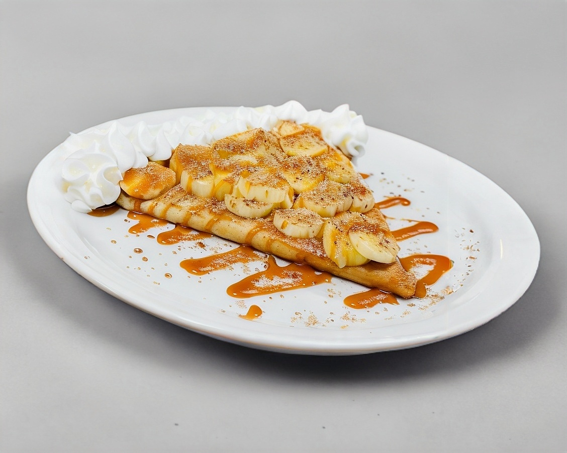 Deliciosa Crepa de Lechera con Canela, acompañada de un heladito licuado de Platano.