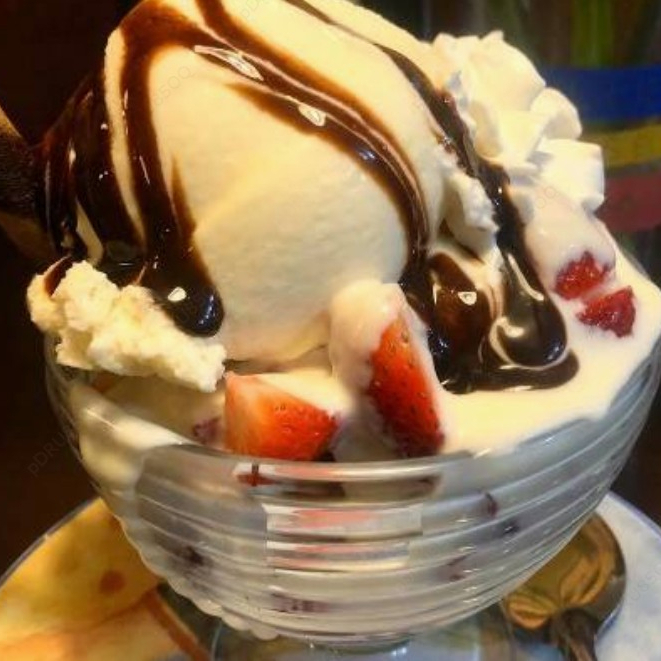 Mermelada de fresa, plátano, fresa, crema batida y Hershey's.