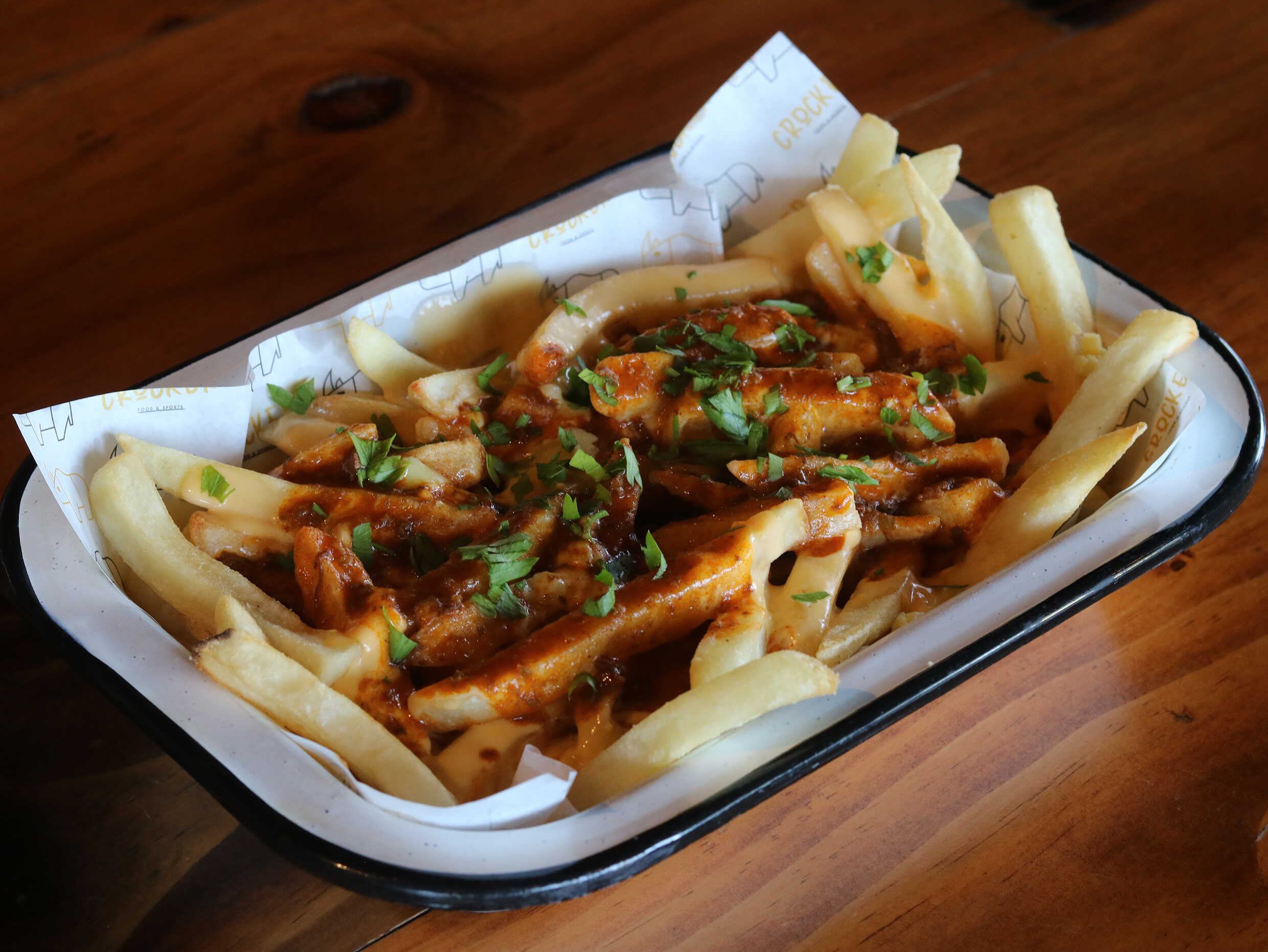 Carne arrechera, carne al pastor, queso gratinado, quedo suizo, cebolla caramelizada piña y cilantro. Acompañada de papas rectas.