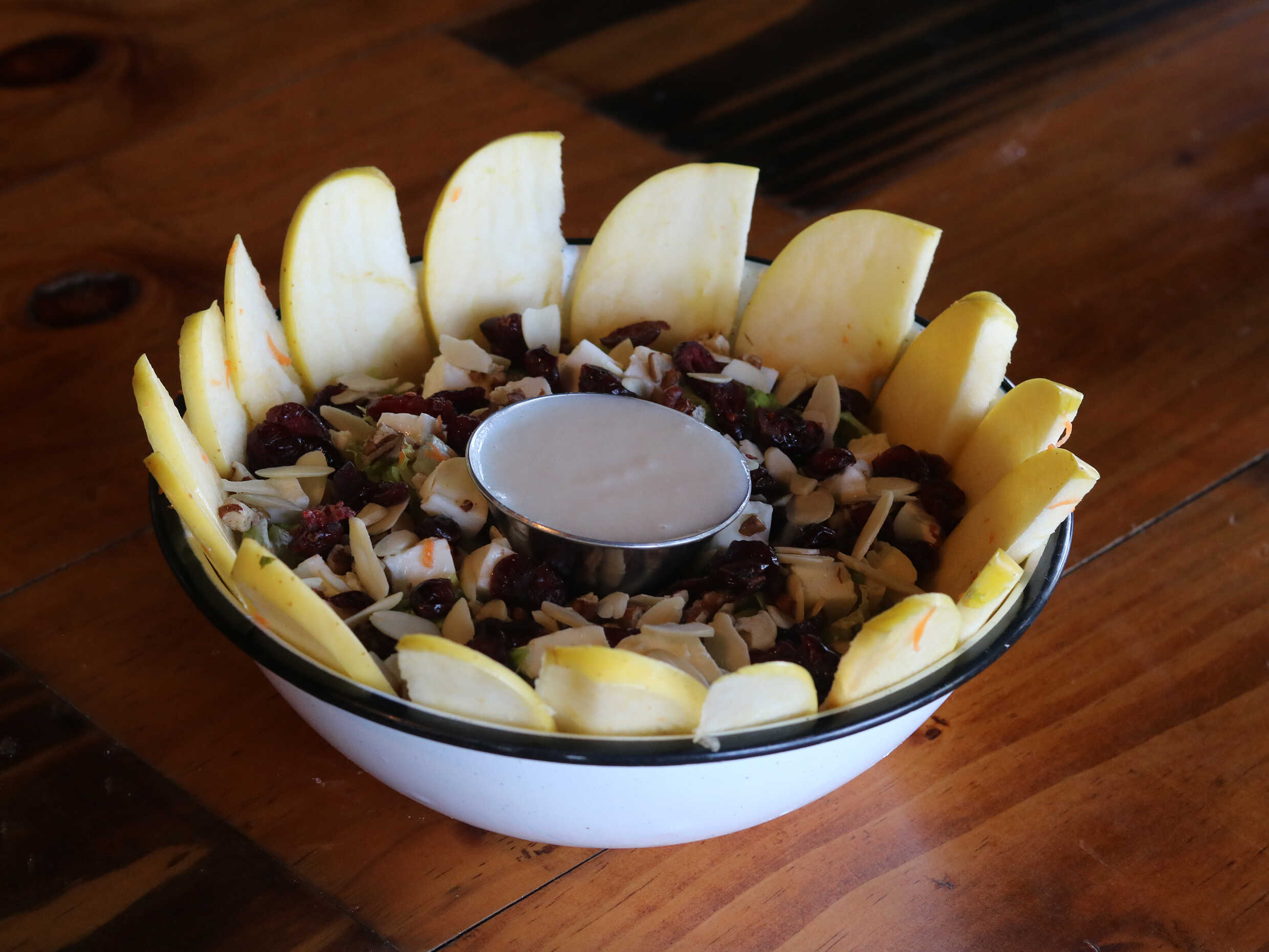 Nuez, arándanos, manzana, queso panela, lechuga y zanahorias, acompañada de vinagreta hecha en casa.