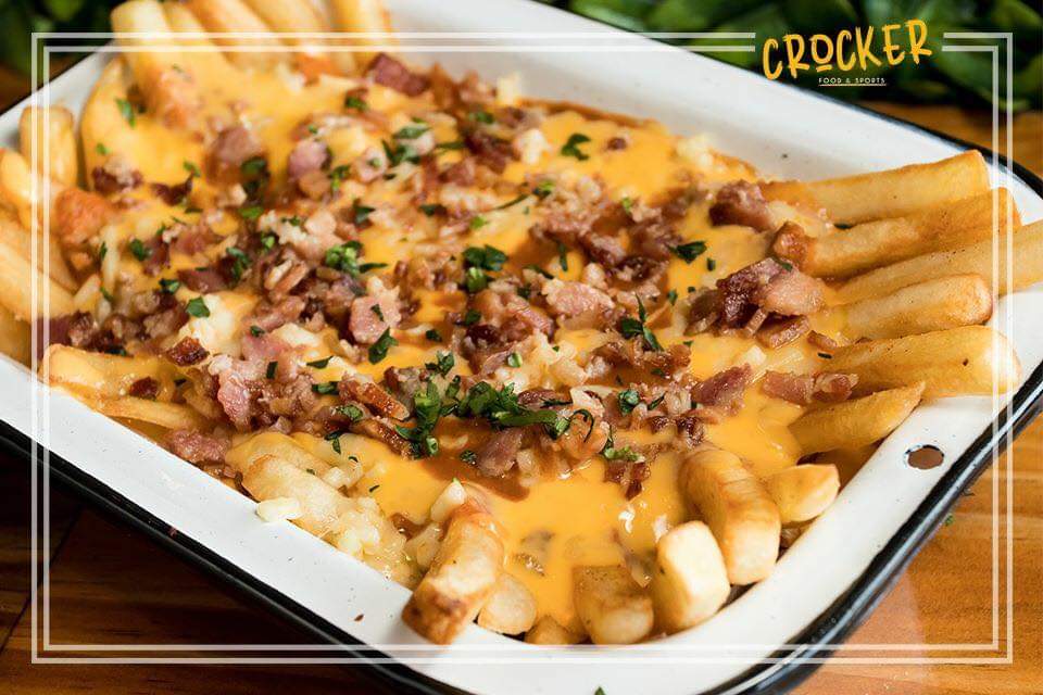 Papas rectas bañadas de queso amarillo, queso gratinado, chilú y tocino, irresistibles.