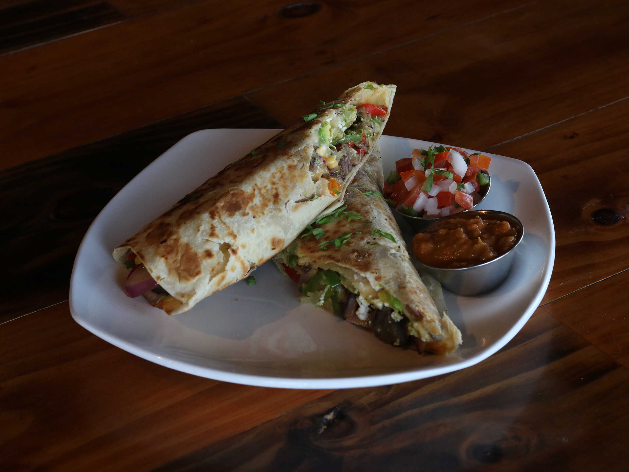 4 tacos de fajita, acompañados de guacamole, pico de gallo y cebolla asada.
