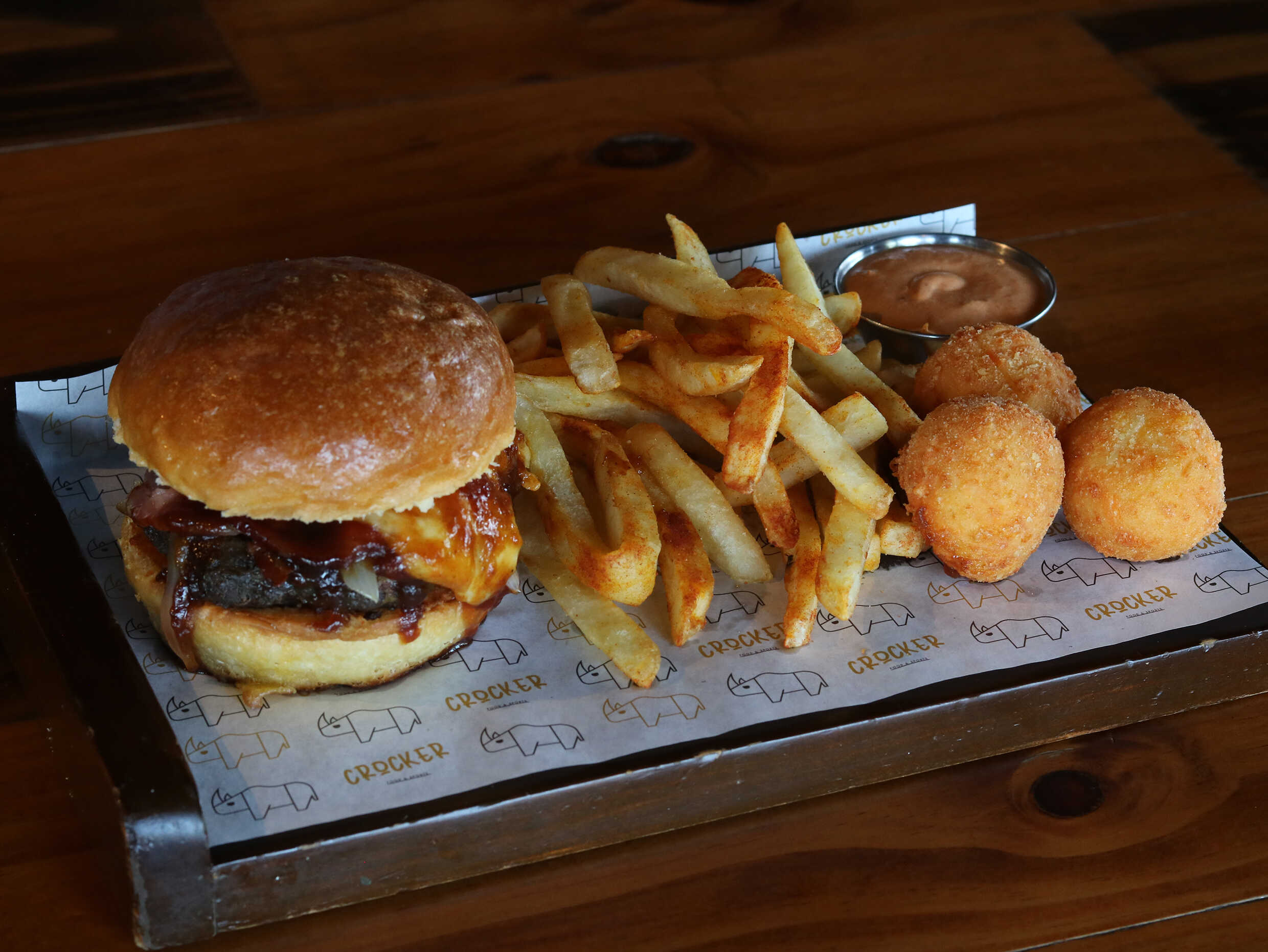 Carne de res, queso suizo, tocino, cebolla caramelizada, y pepinillos empanizados, acompañada de nuestro aderezo cheddar y papas rectas.