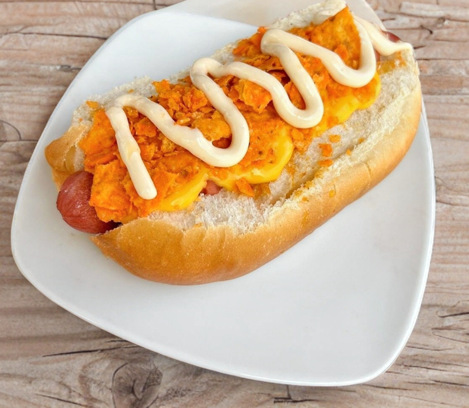 Pan de panadería, mayonesa, salchicha de pavo, queso amarillo derretido, acompañado de crujientes Chettos Flamin Hot o Doritos Nacho y aderezo de habanero.