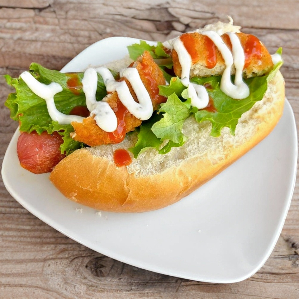 Pan de panadería, mayonesa, salchicha de pavo, hojas frescas de lechuga italiana, trocitos de nuggets de pollo, bañados en aderezo ranch y búffalo.