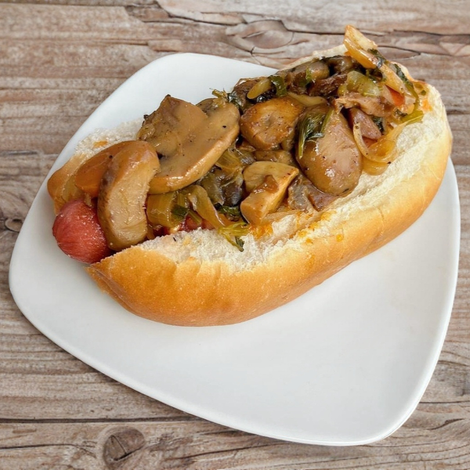 Pan de panadería, mayonesa, salchicha de pavo, deliciosos champiñones fritos en mantequilla con cebolla caramelizada, acompañados de cilantro, especias, zanahoria, un toque de chile de árbol y aderezo de guacamole.