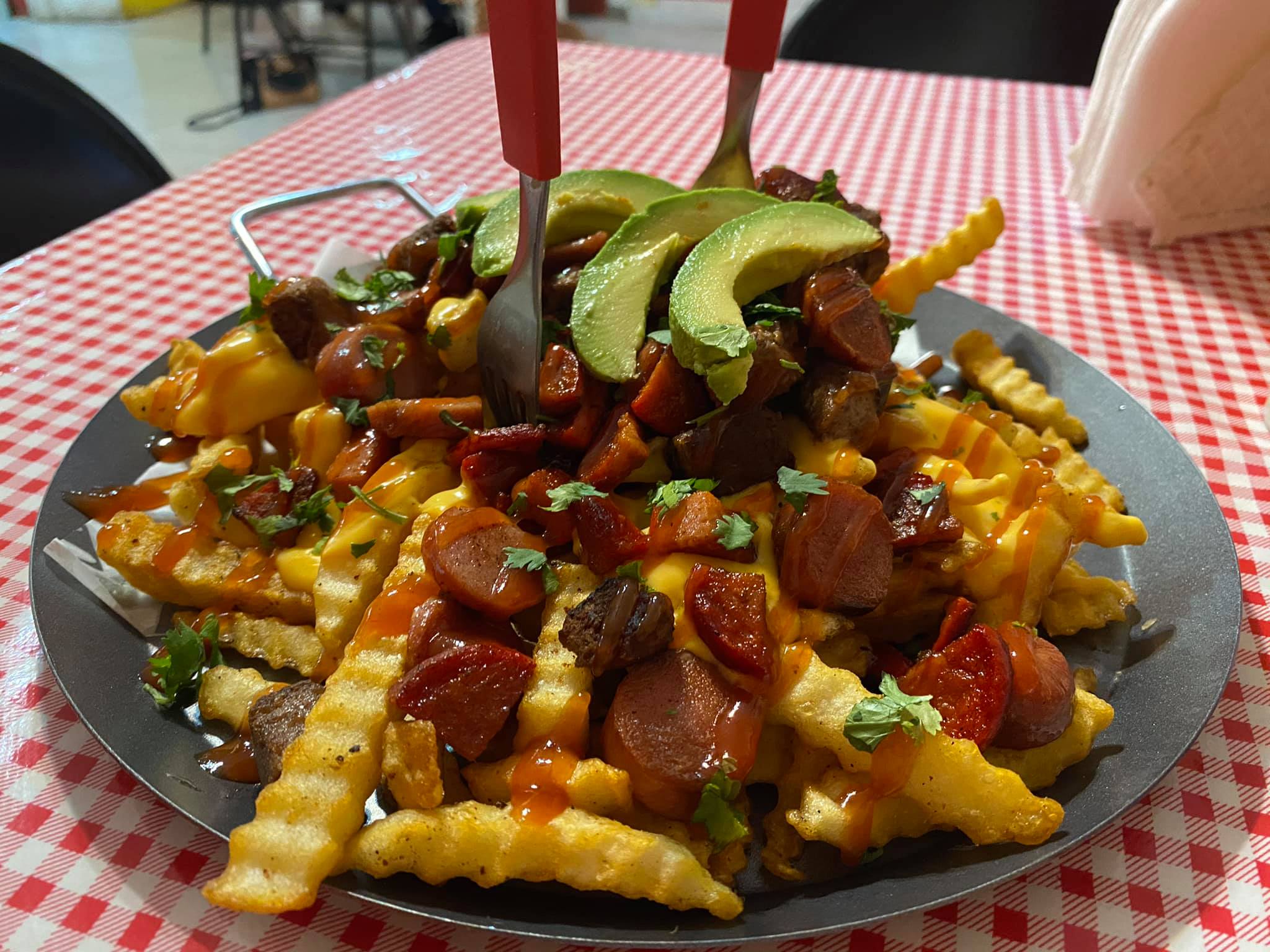 Disfruta de una gran porción de papas fritas recién hechas, acompañadas de queso amarillo derretido, trocitos de salchicha de pavo y de asar, trocitos de carne de res, cátsup, ranch, cilantro y rajas de aguacate.