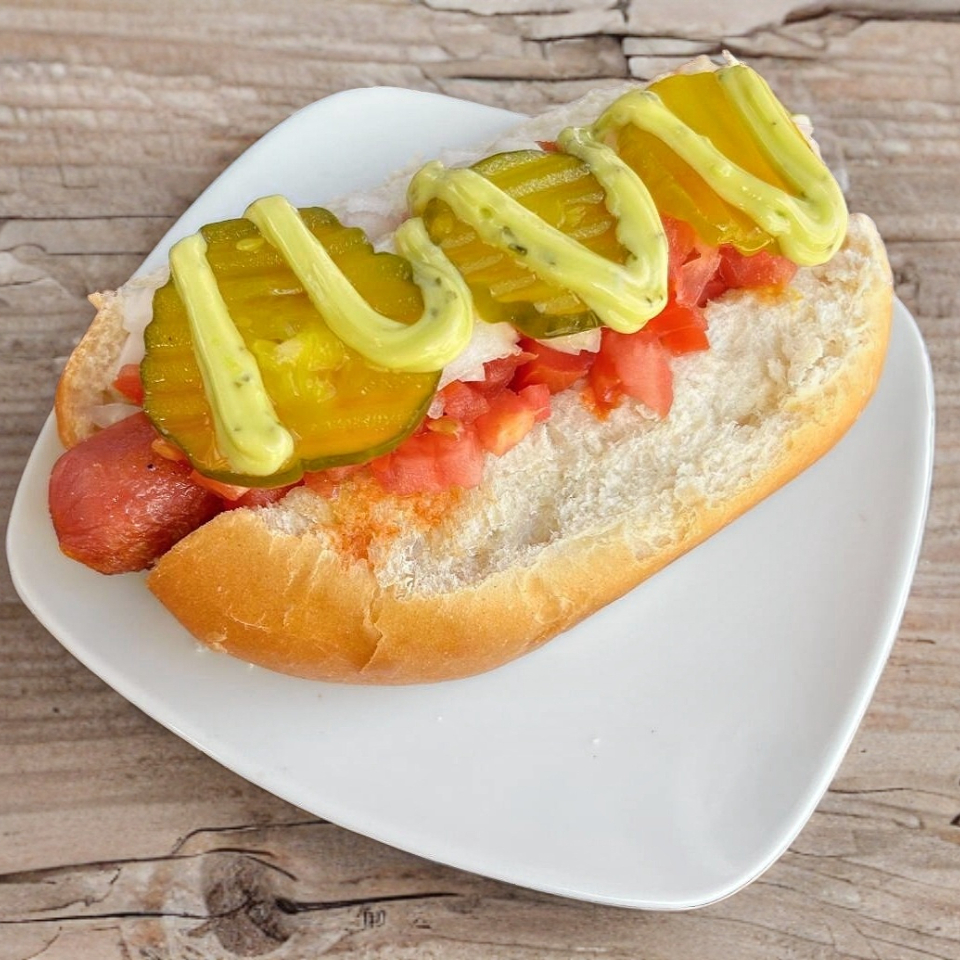 Pan de panadería, mayonesa, salchicha Jumbo de cerdo Óscar Mayer, tomate y cebolla finamente picados, rodajas de pepinillos y aderezo de guacamole.