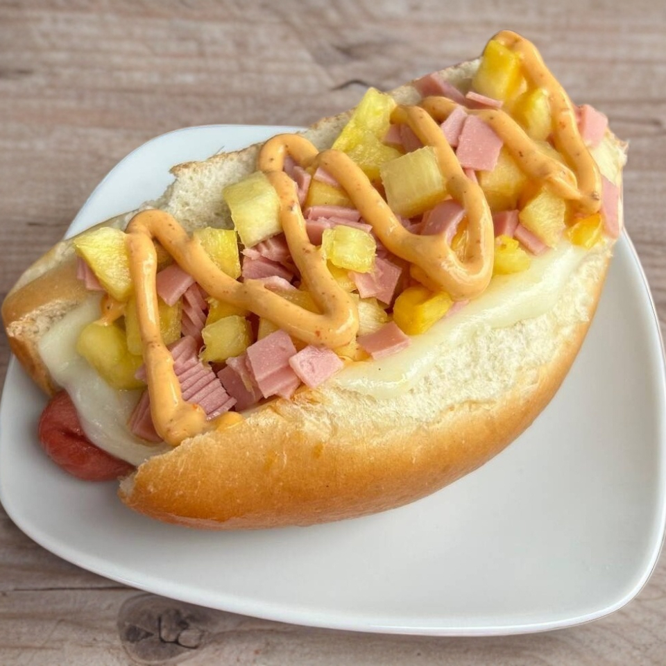 Pan de panadería, mayonesa, salchicha de pavo, cremoso queso mozzarella derretido, trocitos de piña natural con jamón frito y aderezo de chipotle.