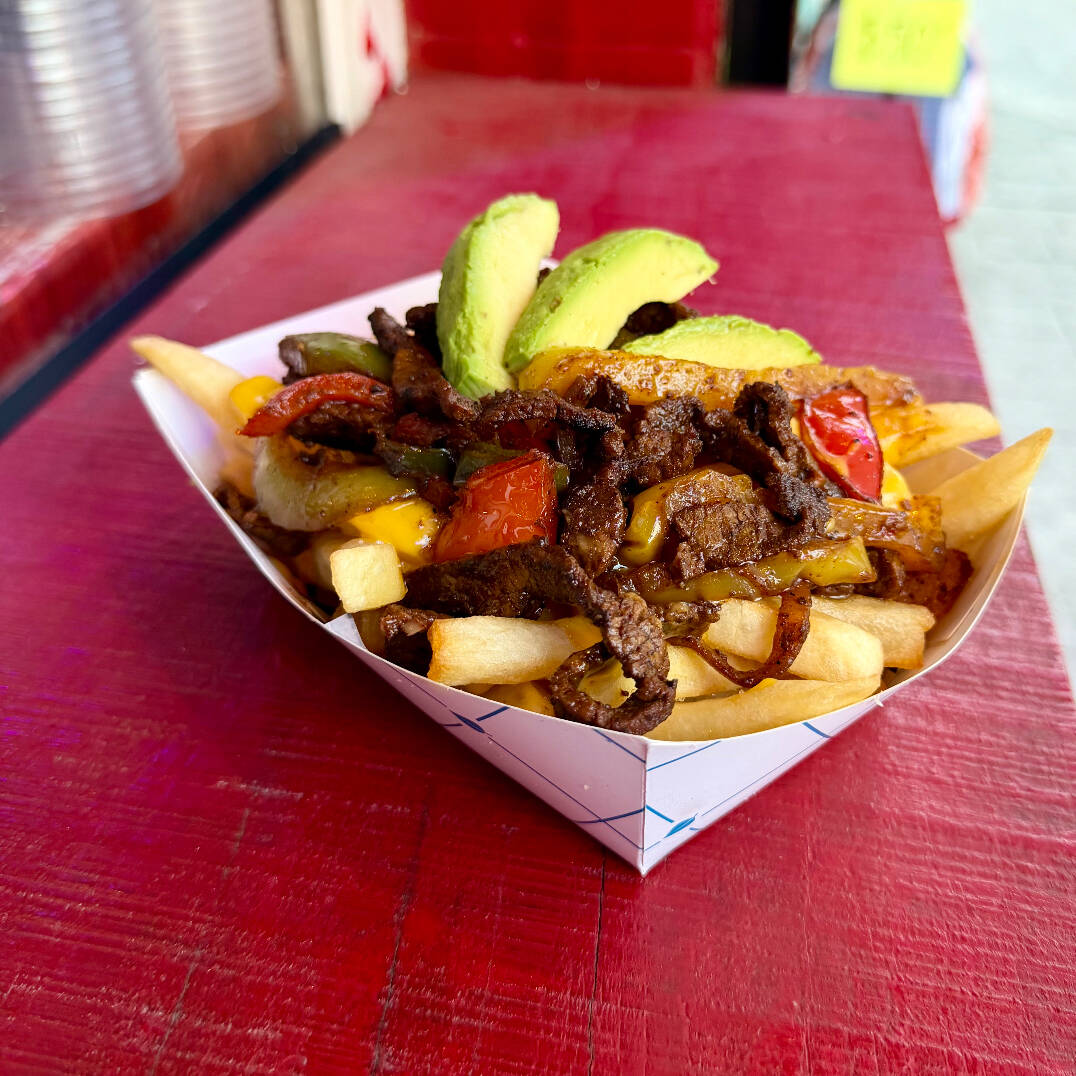 Papas a la francesa o gajo bañadas con queso amarillo derretido, exquisita fajita de res guisada con cebolla, chile morrón. condimentos y como topping aguacate.