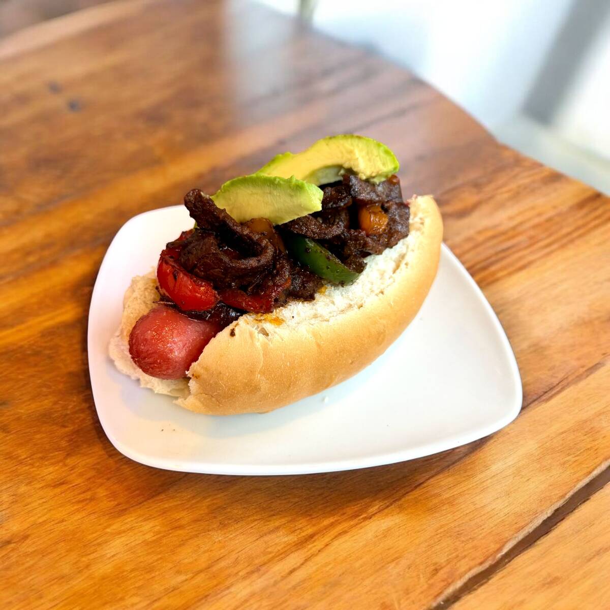 Pan de panadería, mayonesa, salchicha de pavo, deliciosa fajita de res frita con chile morrón, cebolla, condimentos y como topping rajitas de aguacate..