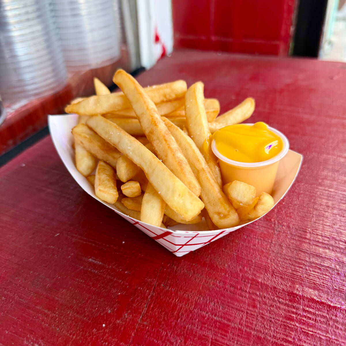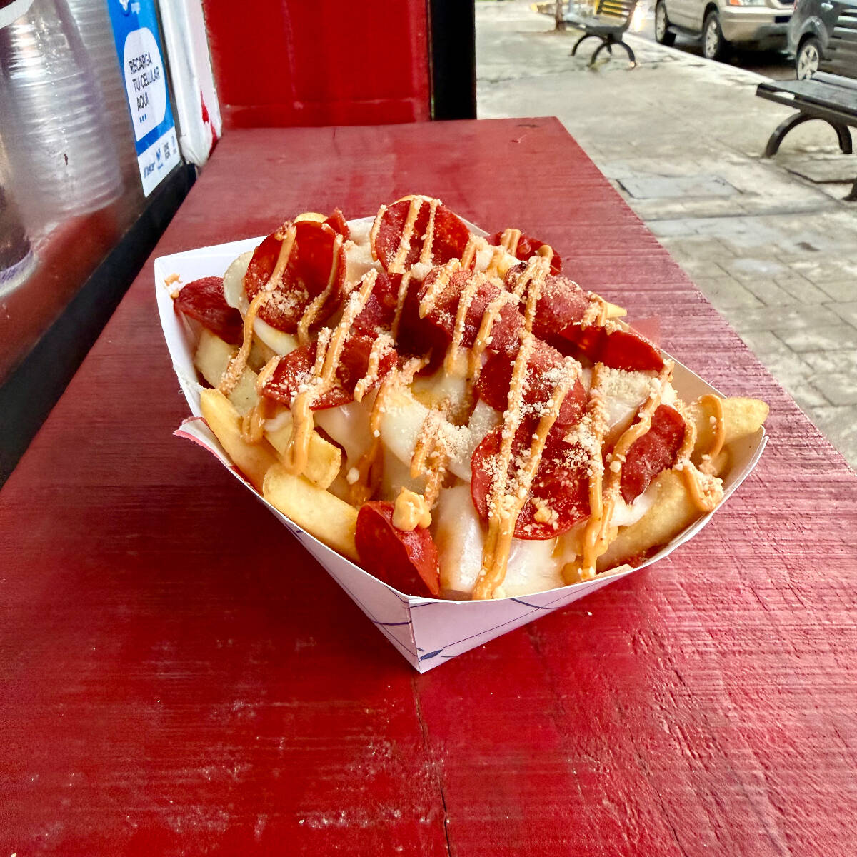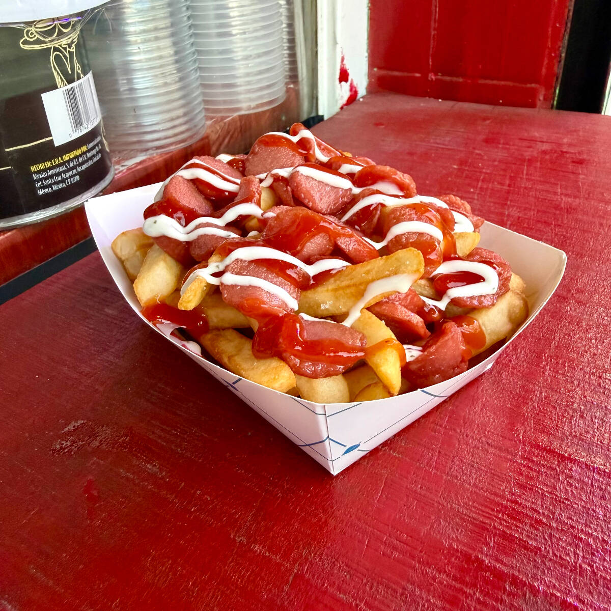 Disfruta de una porción de papas fritas recién hechas, acompañadas de trocitos de salchicha de pavo, bañadas en aderezos de tu elección.
