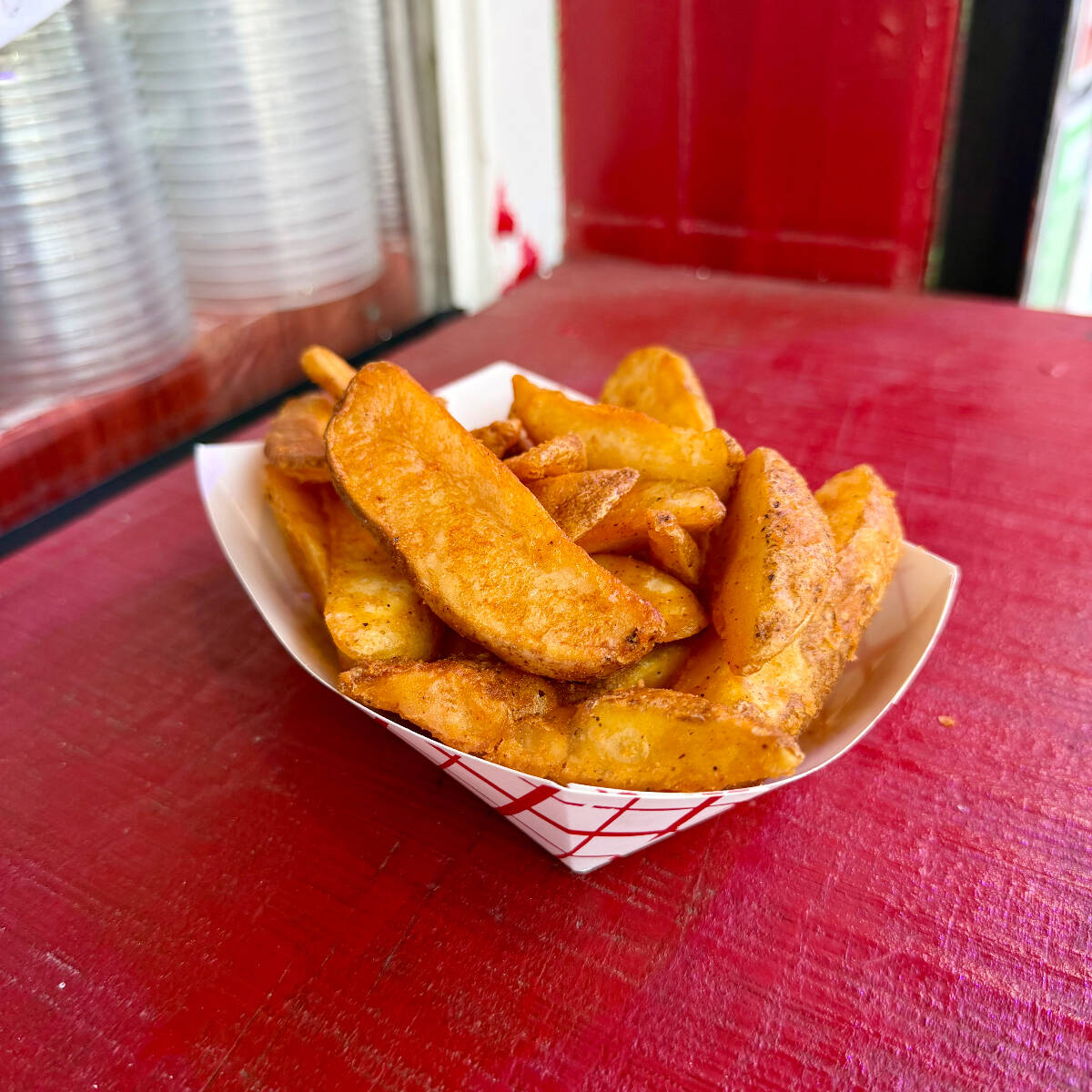 Crujientes Papas Gajo recién hechas, condimentadas, bañadas en deliciosos aderezos a tu elección.