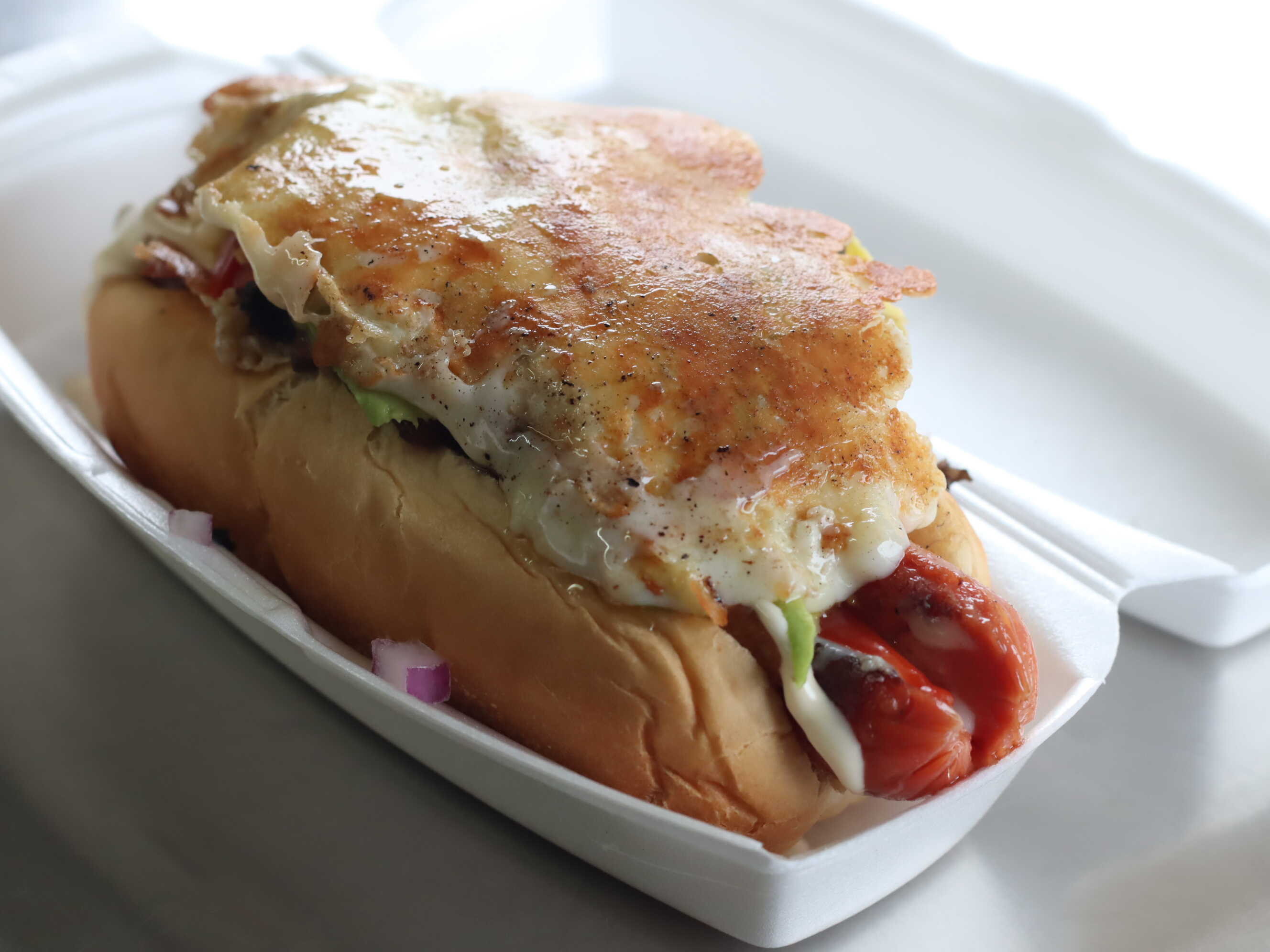 Salchicha jumbo de pavo, champiñones, cebolla frita, cebolla morada, chile, tomate, catsup, mayonesa, mostaza, aguacate cubierta por una costra de queso manchego.