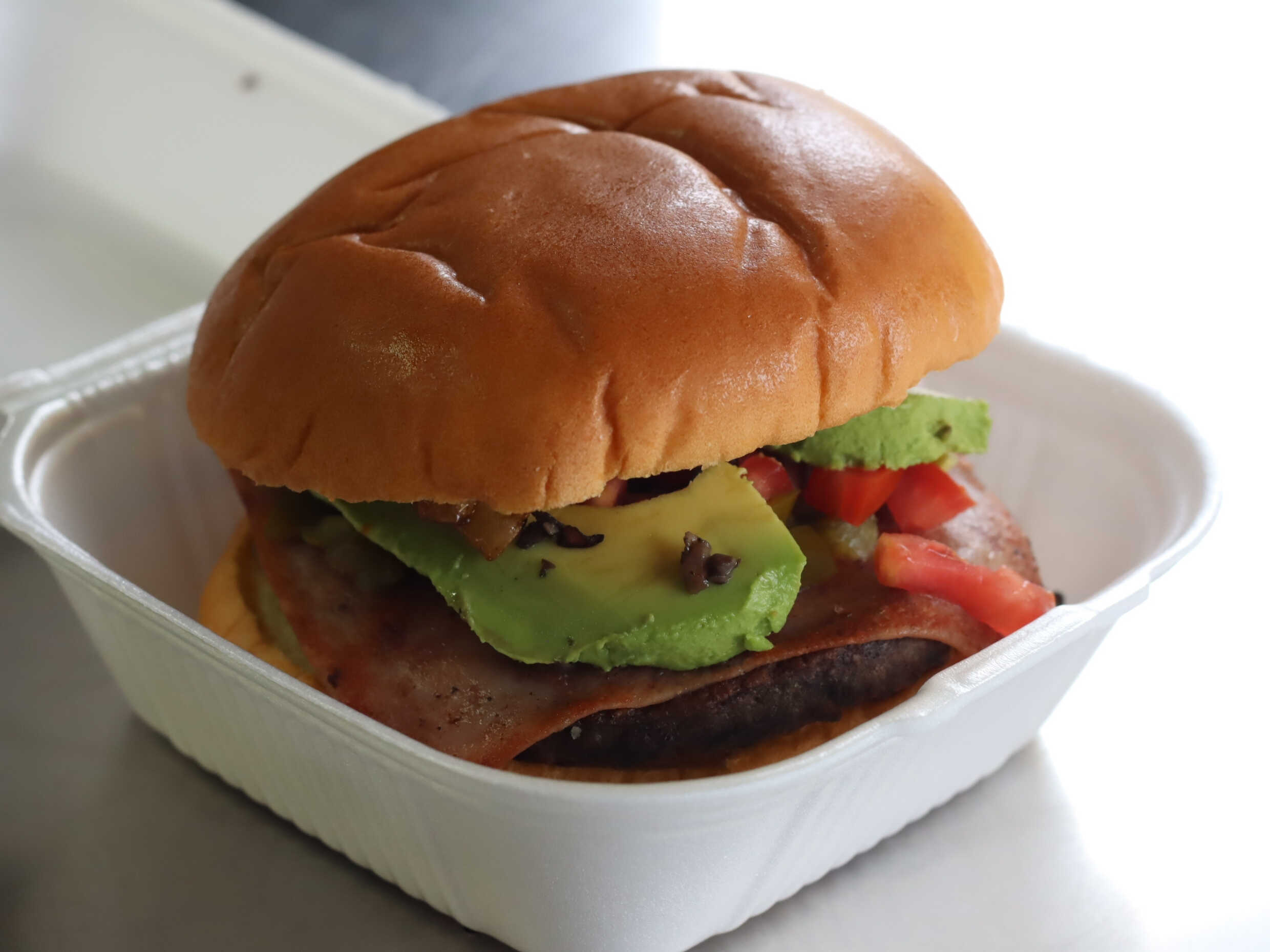 Carne arrachera con, jamón de pavo, queso manchego, cebolla frita, champiñón, cebolla morada, chile, tomate, cátsup, mayonesa, aguacate y pan brioche.