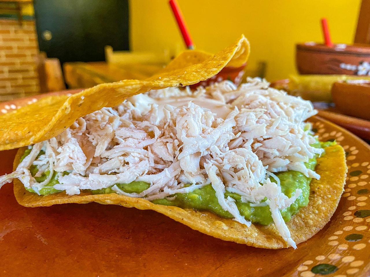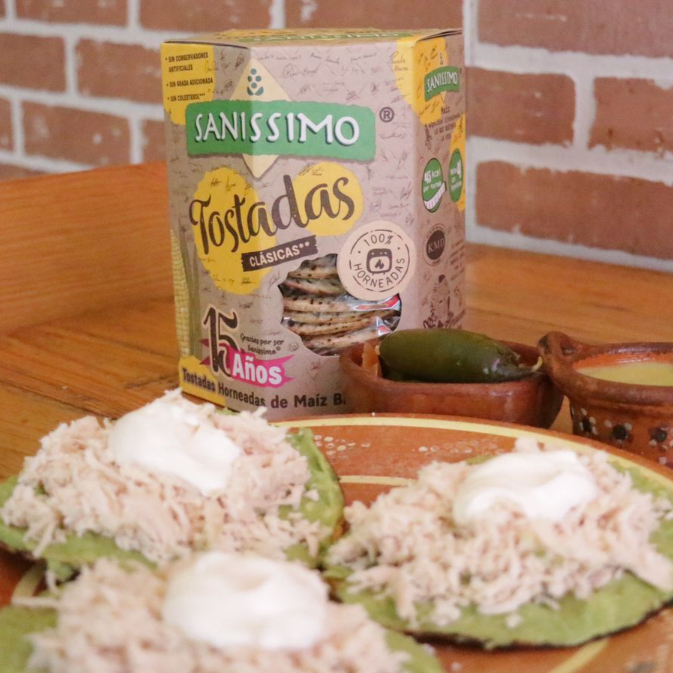 3 Tostadas sanissimo con pechuga de pollo y guacamole.