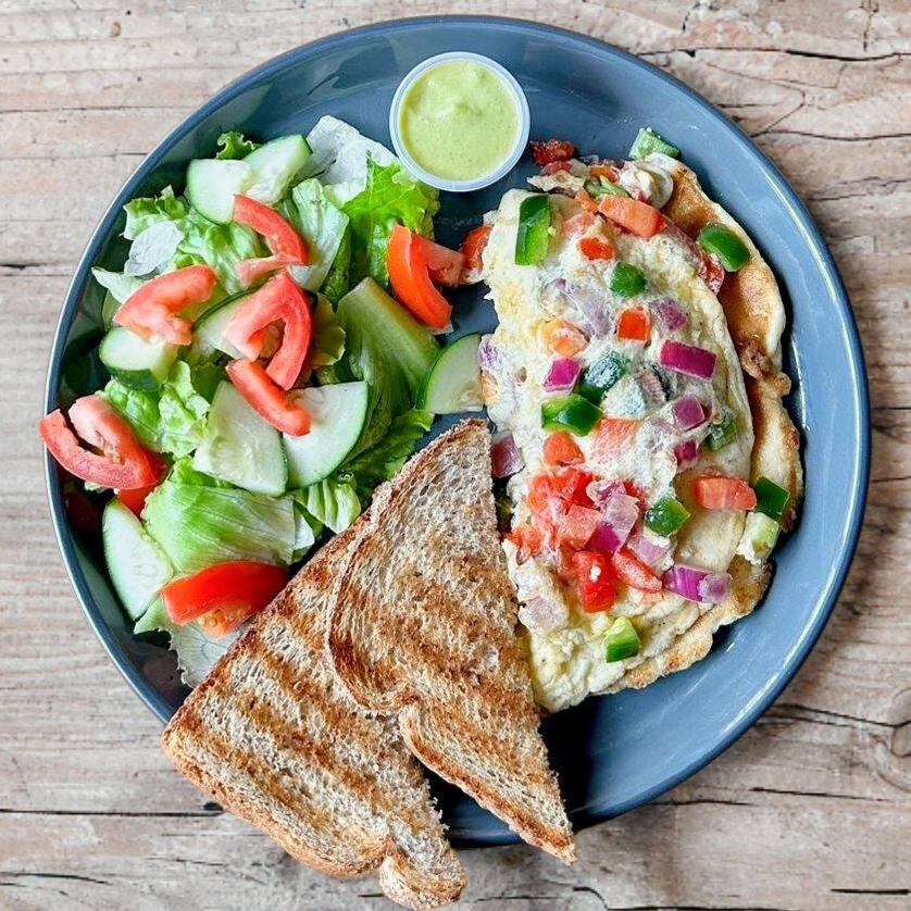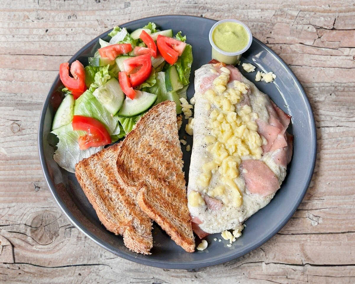 CLARAS DE HUEVO, QUESO MANCHEGO, LECHUGA, TOMATE, PEPINO, PAN TOSTADO Y SALSA