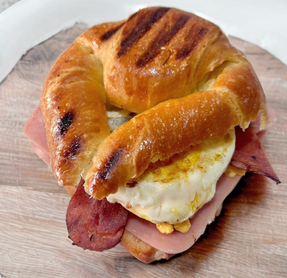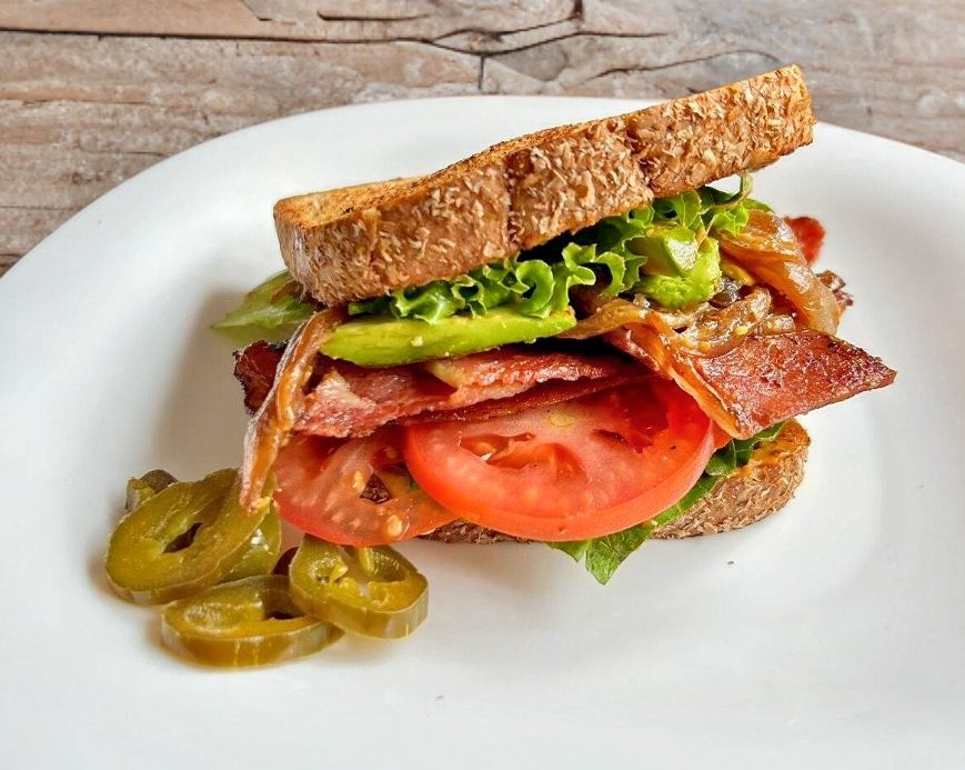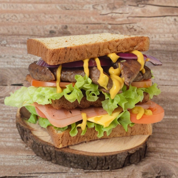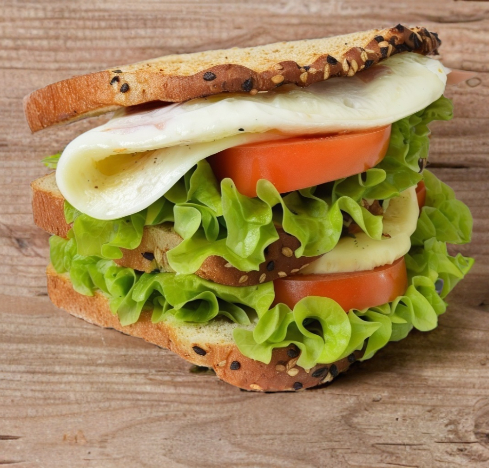 HUEVO ESTRELLADO,POLLO A LA PLANCHA, PANES INTEGRALES, TOCINO, MAYONESA, LECHUGA ROMA,TOMATE, QUESO AMERICANO