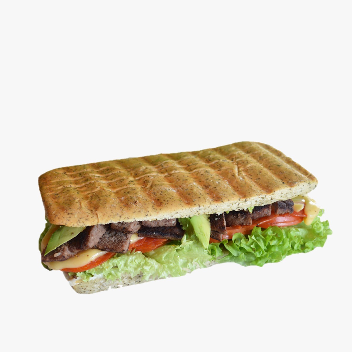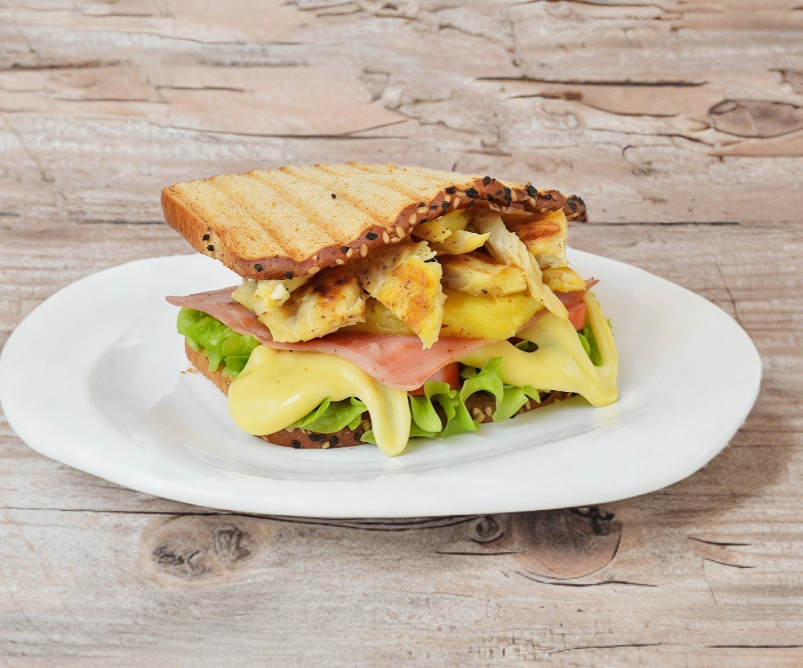 PAN MULTIGRANO, POLLO A LA PLANCHA, QUESO AMERICANO, QUESO BLANCO, TOCINO, PIÑA, LECHUGA, TOMATE Y MAYONESA
