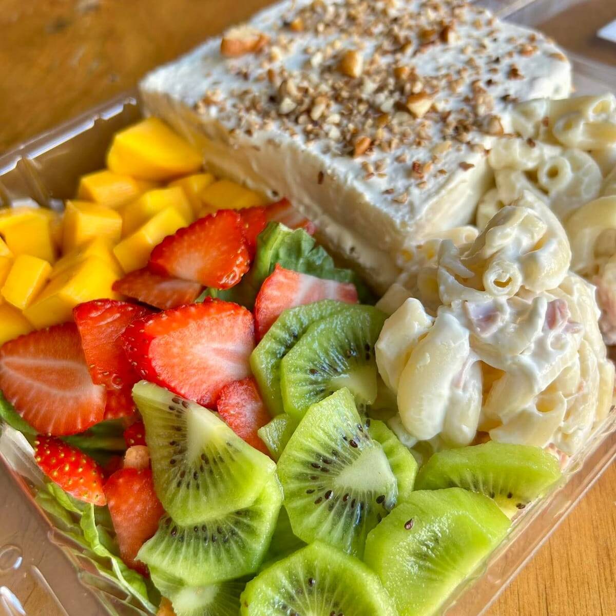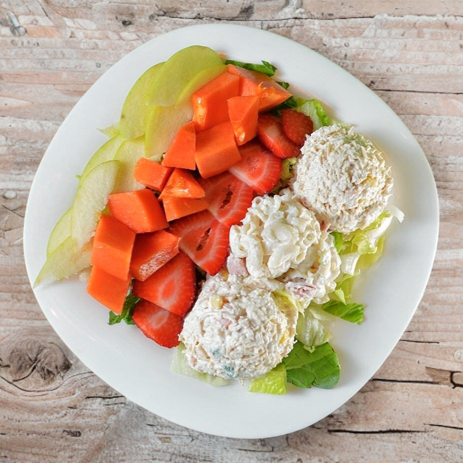 2 PORCIONES DE ENSALADA DE POLLO, 1 PORCIÓN DE CODOS, BASE DE LECHUGA MIX, 3 FRUTAS A ELEGIR, 3 PAQUETES DE GALLETAS Y 1 PORCIÓN DE CHILES EN VINAGR