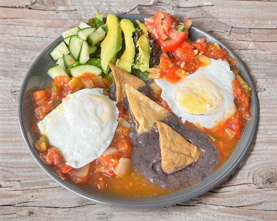 2 HUEVOS BAÑADOS EN SALSA RANCHERA ENSALADA AGUACATE Y FRIJOLES