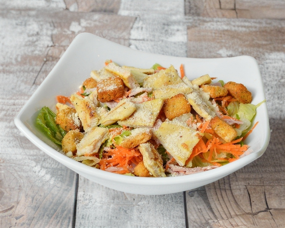 100 gr. POLLO A LA PLANCHA, 3 REBANADAS JAMÓN, CRUTONES, ZANAHORIA RALLADA, MIX DE LECHUGAS, QUESO PARMESANO Y ADEREZO CHIPOTLE