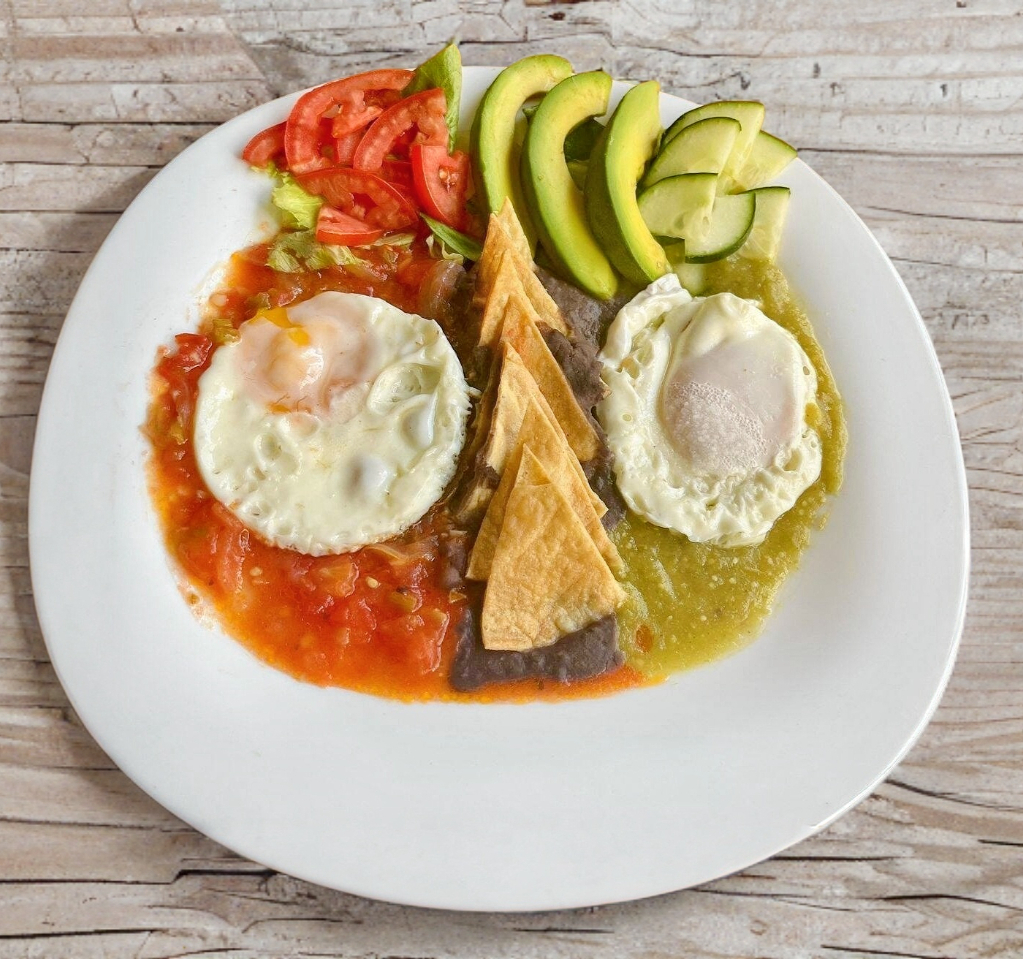DOS HUEVOS BAÑADOS EN SALASA ROJA Y VERDE FRIJOLES ENSALADA AGUACATE Y FRIJOLES