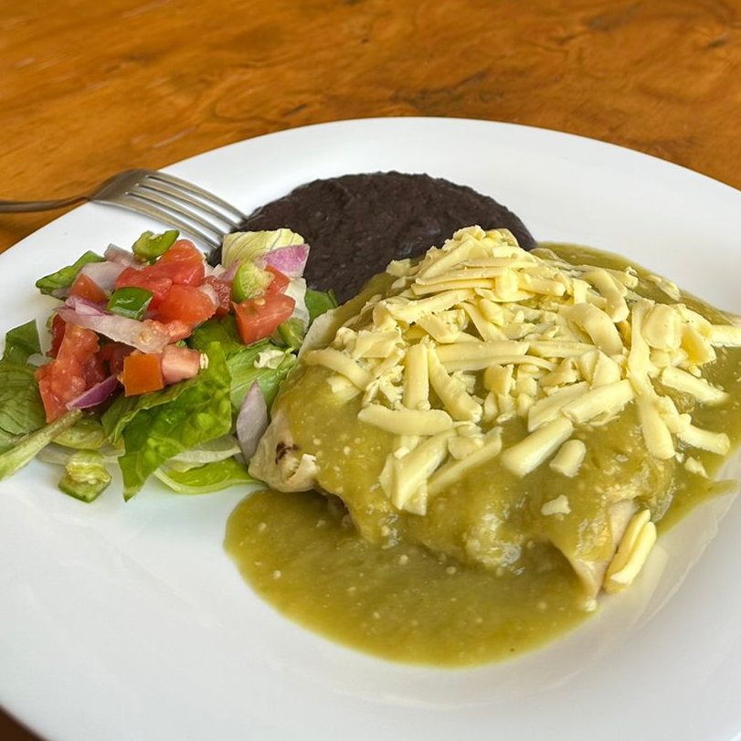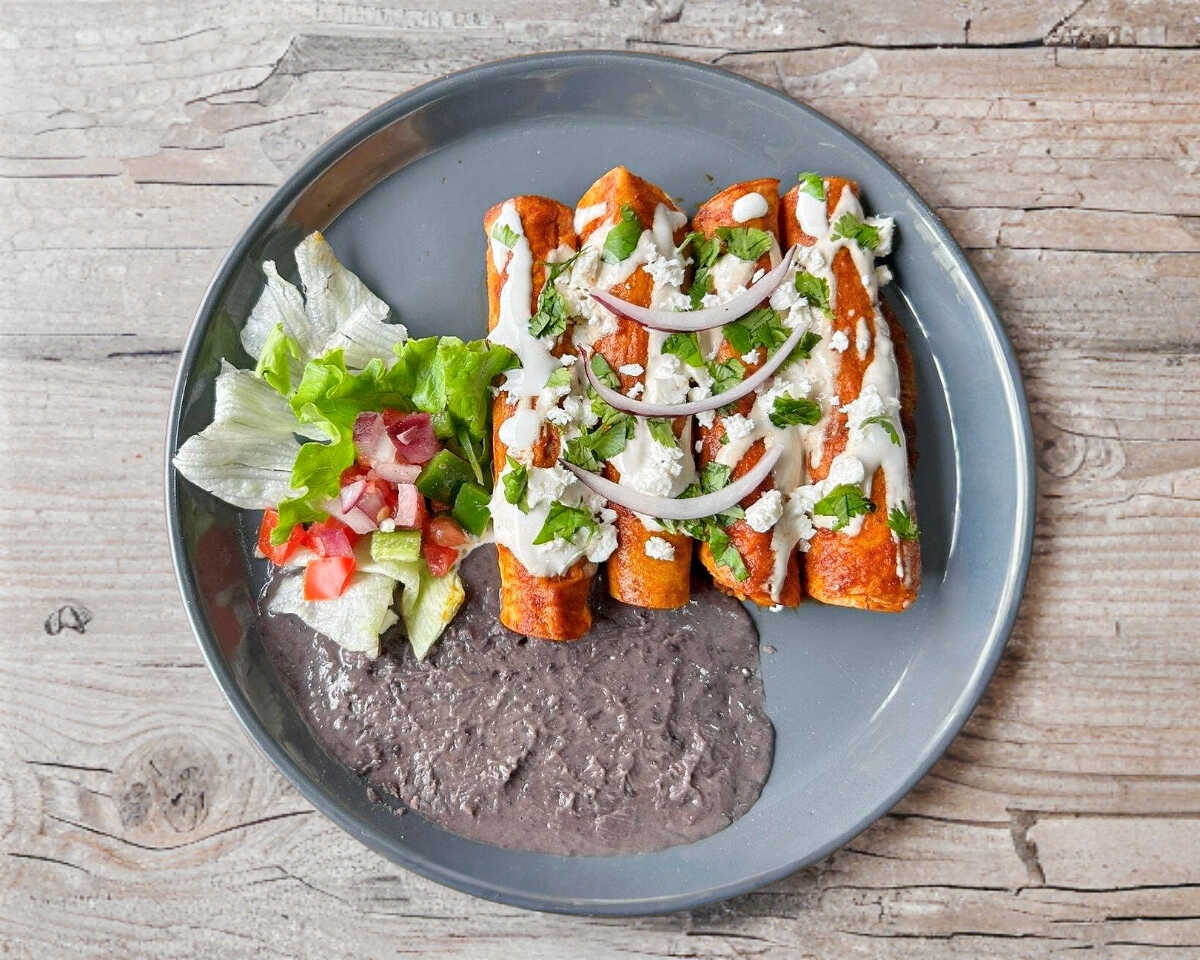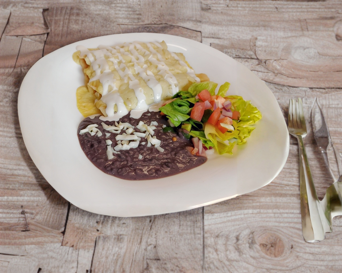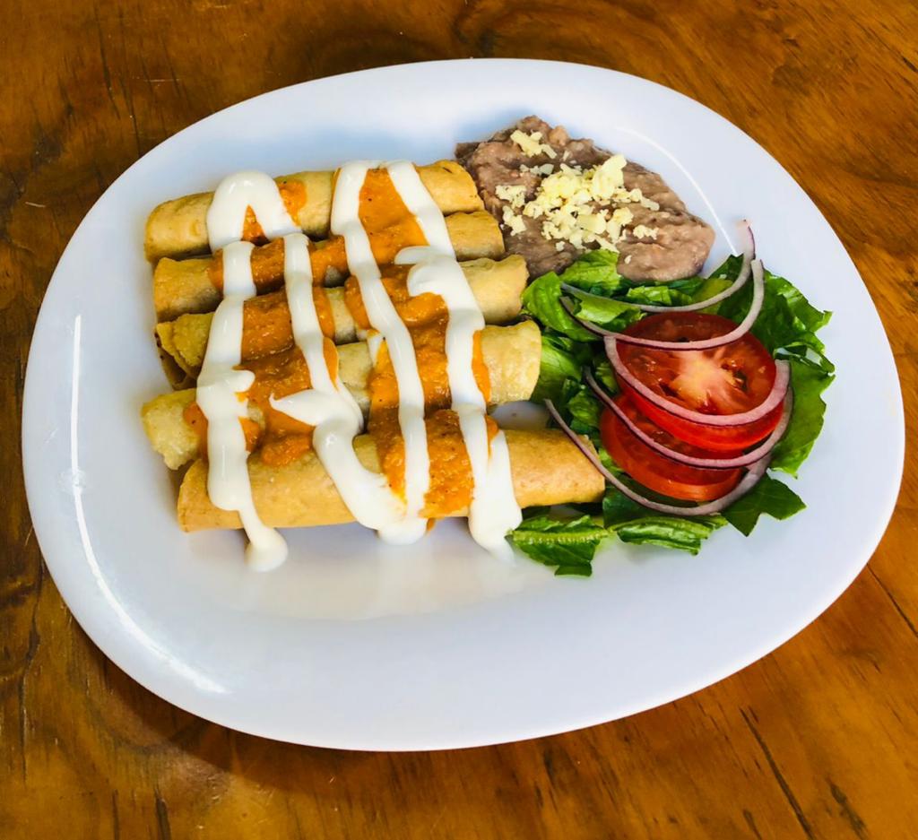 TACOS DORADOS DE POLLO, MIX DE LECHUGA, FRIJOLES, CERMA, TOMATE, SALSA Y CEBOLLA MORADA