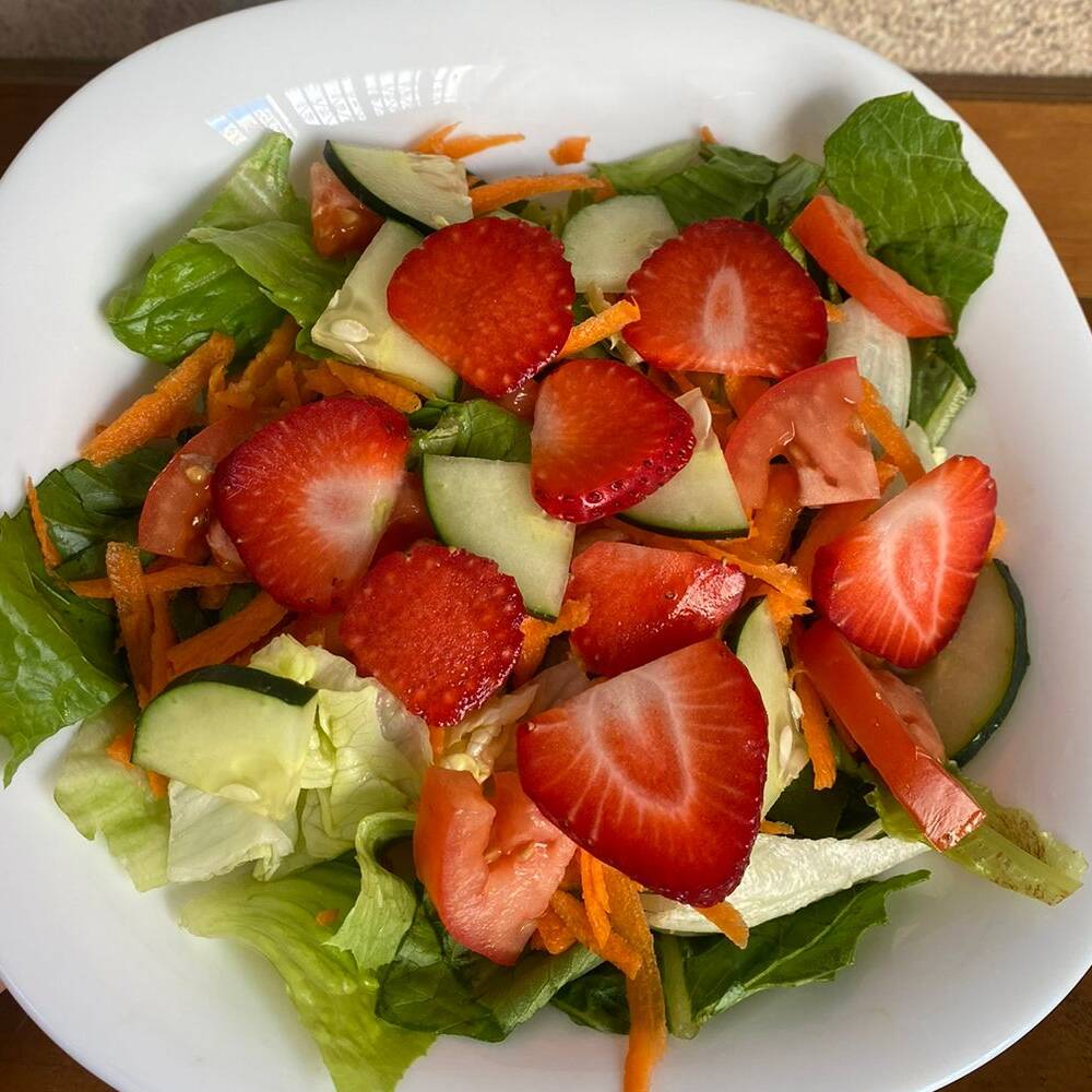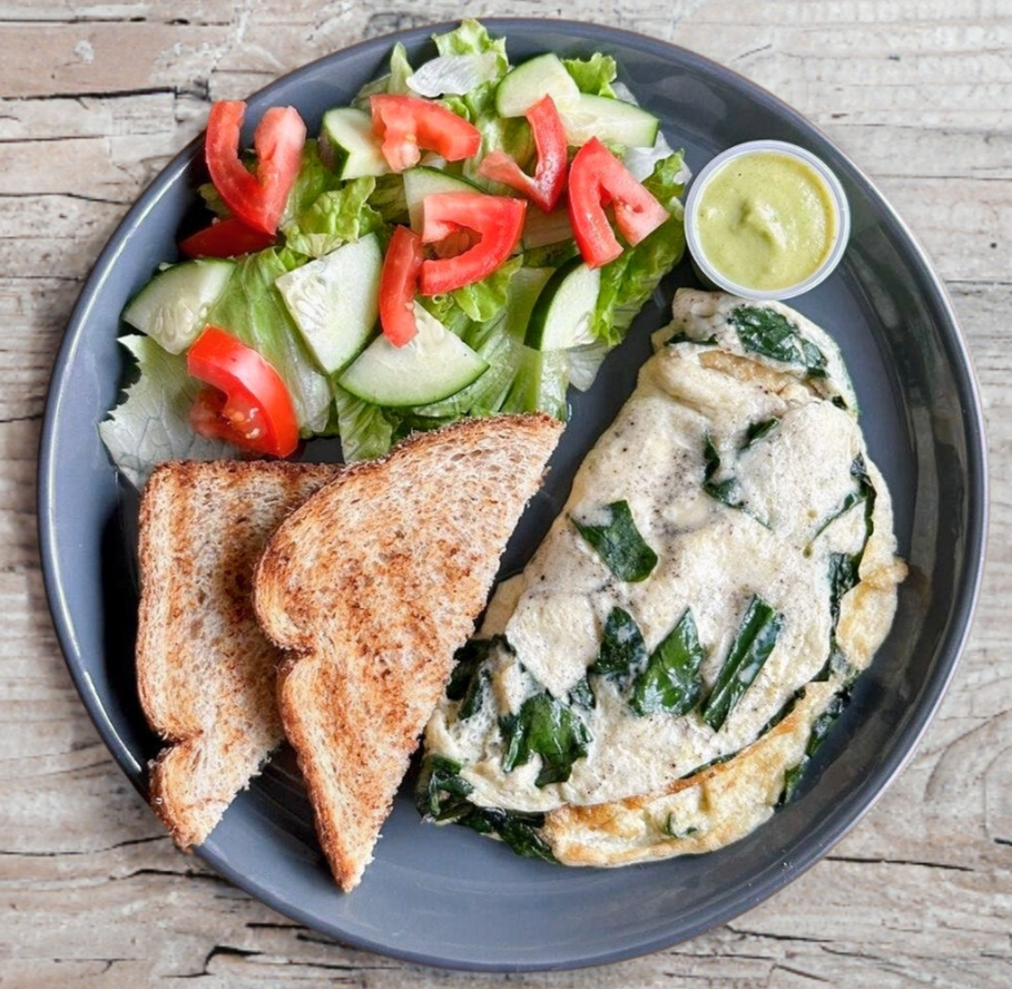 CLARAS DE HUEVO, ESPINACA, LECHUGA, TOMATE, PEPINO, PAN TOSTADO Y PORCIÓN DE SALSA