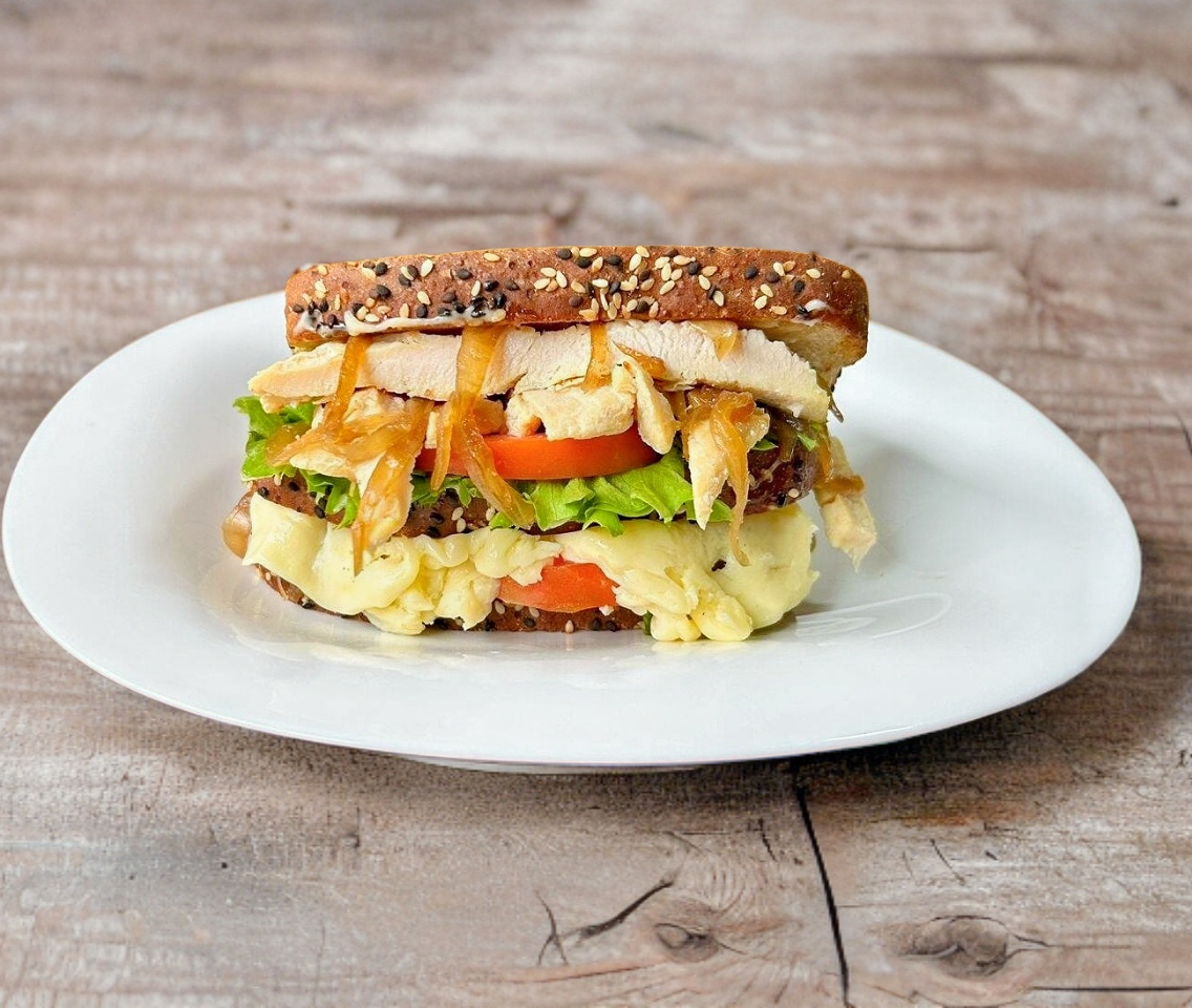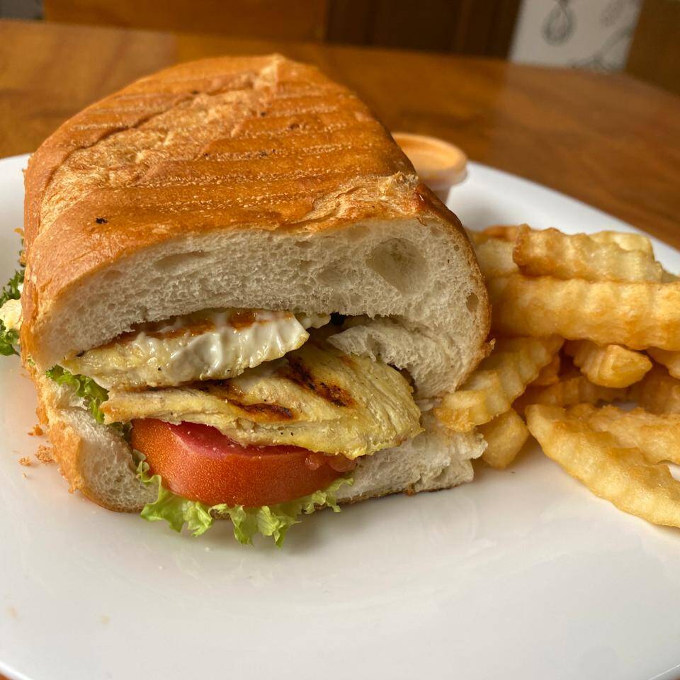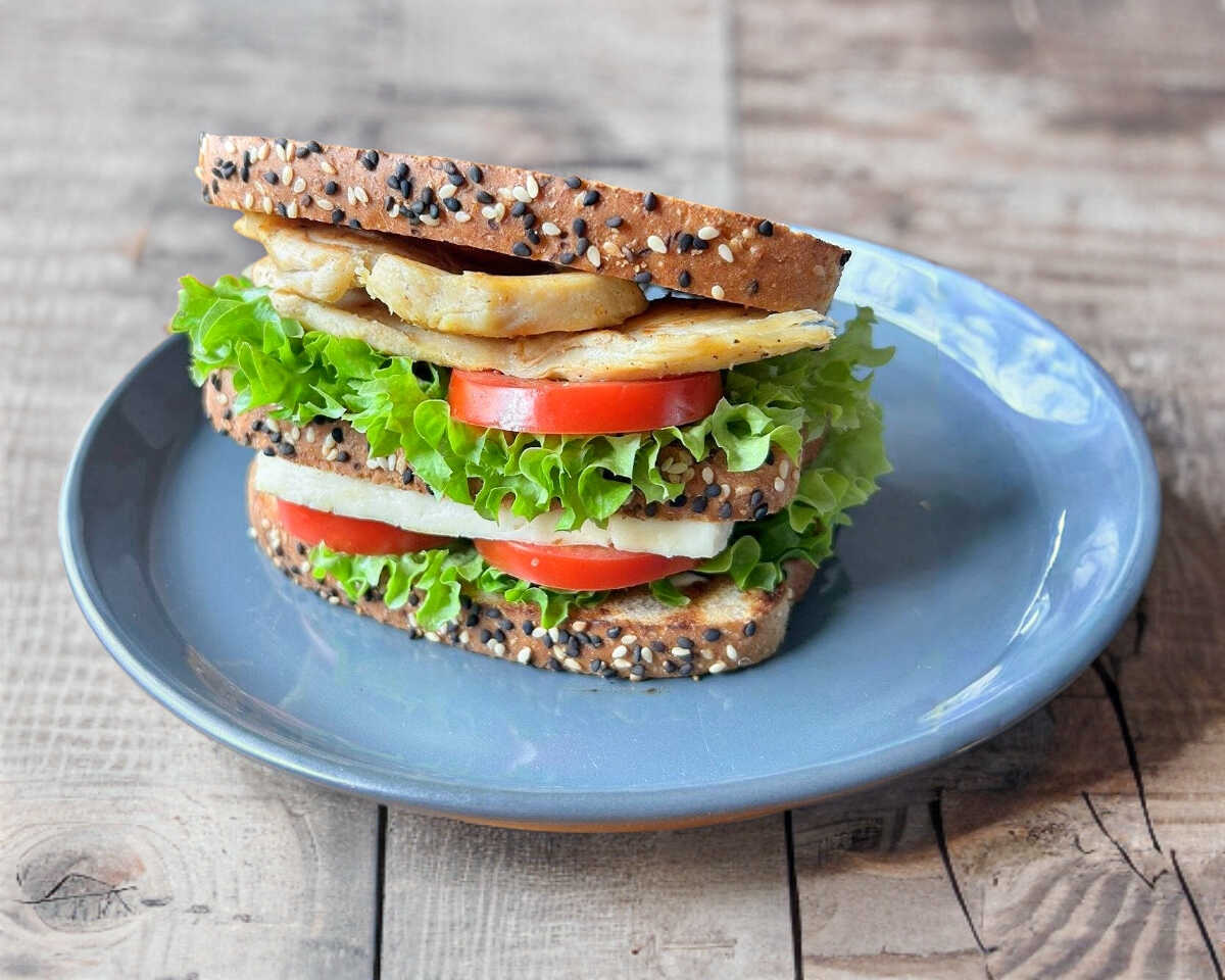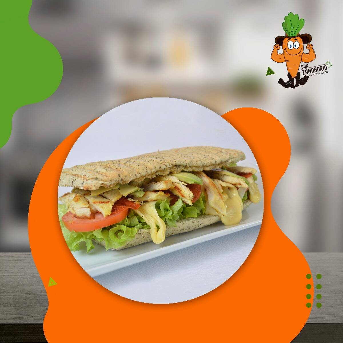 PAN MULTIGRANO, MAYONESA, POLLO A LA PLANCHA, LECHUGA, TOMATE, QUESO PANELA.
