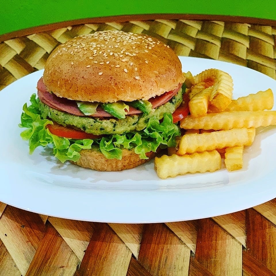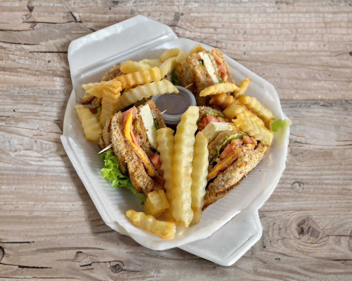 PAN INTEGRAL, MAYONESA, LECHUGA, TOMATE, PANELA JAMON, QUESO AMERICANO, PAPAS A LA FRANCESA Y PORCION DE ENSALDA DE POLLO.