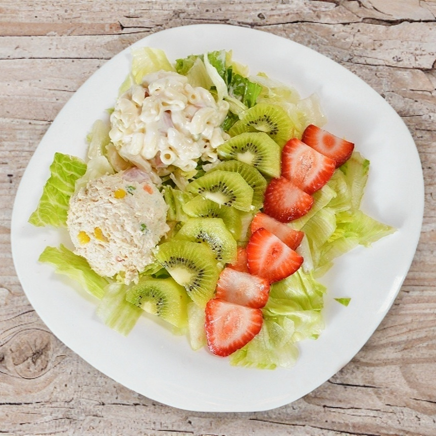 1 PORCIÓN DE ENSALADA DE POLLO, 1 PORCIÓN DE ENSALADA CODOS, BASE DE LECHUGA MIX (ROMANA,OREJONA) , 2 FRUTAS A ELEGIR, 2 PAQUETES DE GALLETAS Y 1 PORCIÓN CHILES EN VINAGR