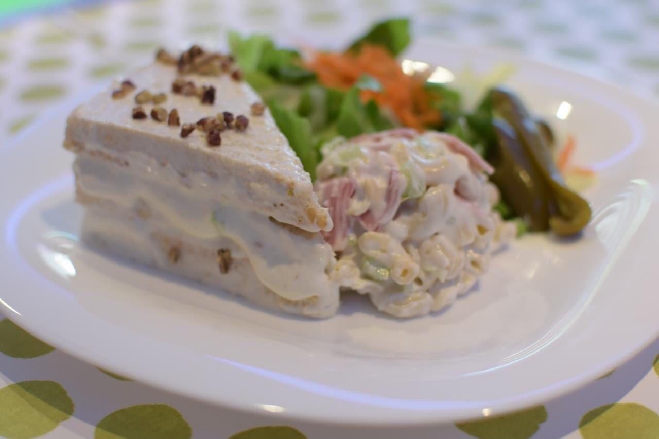 SANDWICHÓN, ENSALADA DE POLLO, ENSALADA DE CODOS, MIX DE LECHUGA, ZANAHORIA Y CHILES JALAPEÑO