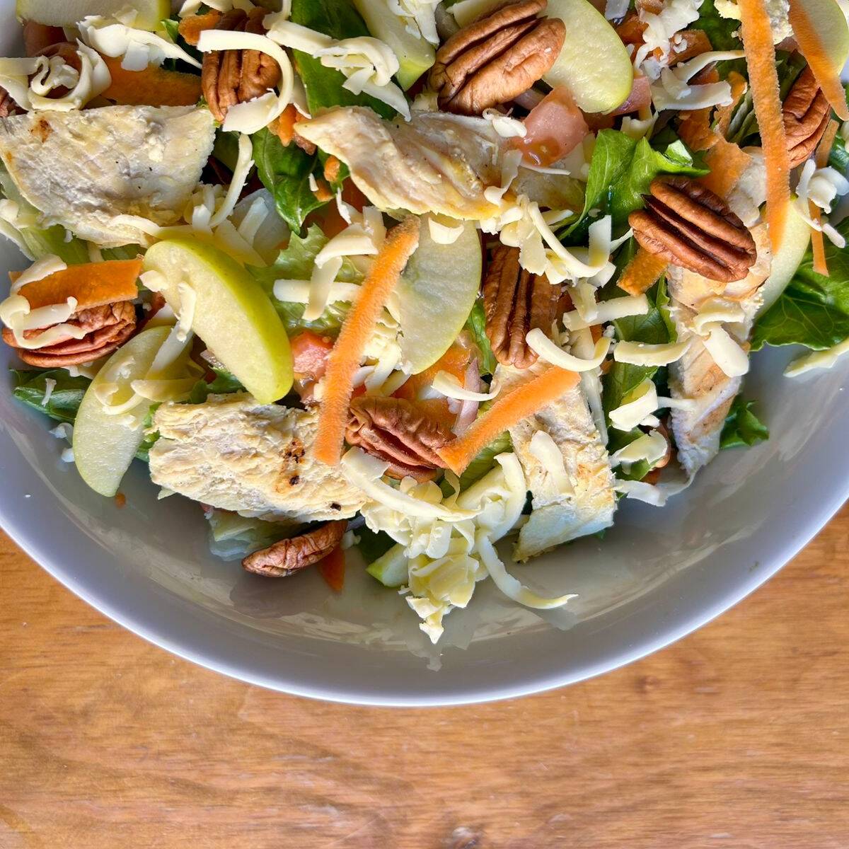 MIX DE LECHUGA, DE POLLO A LA PLANCHA, RODAJAS TOMATE, CUADRO DE QUESO PANELA, NUEZ, MANZANA Y ADEREZO CHIPOTLE